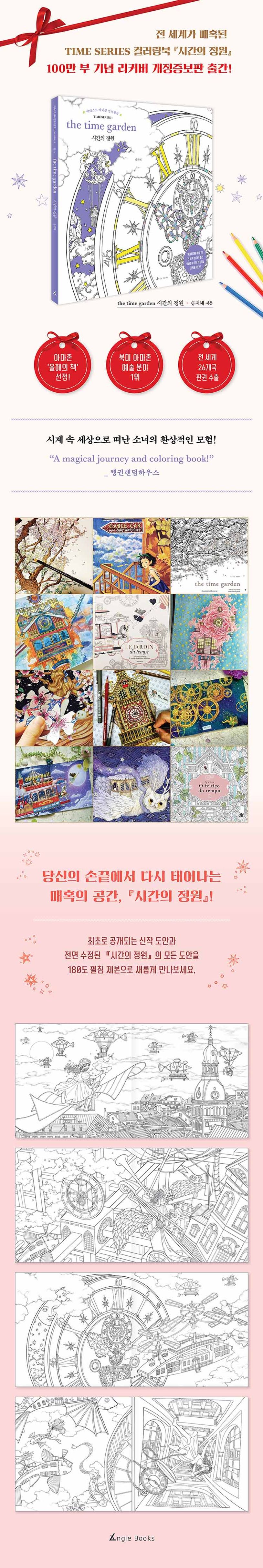 미국, 영국, 프랑스, 대만 등지에서 베스트셀러 컬러링북으로 사랑받아온 글로벌 아티스트 송지혜의『시간의 정원』이 전 세계 100만 부 판매를 기념해 ‘리커버 개정증보판’으로 돌아왔다. 이번 에디션에는 작가의 예술적 감성과 상상력이 넘치는 신작 도안들이 최초로 공개되었으며, 기존의 도안도 전면 수정 보완하였다. 더욱 업그레이드된 시간 요정과 소녀의 모험, 그리고 환상적인 공간 속에 숨겨진 이야기를 통해 컬러링을 하며 동화 속 주인공이 되어 보자.