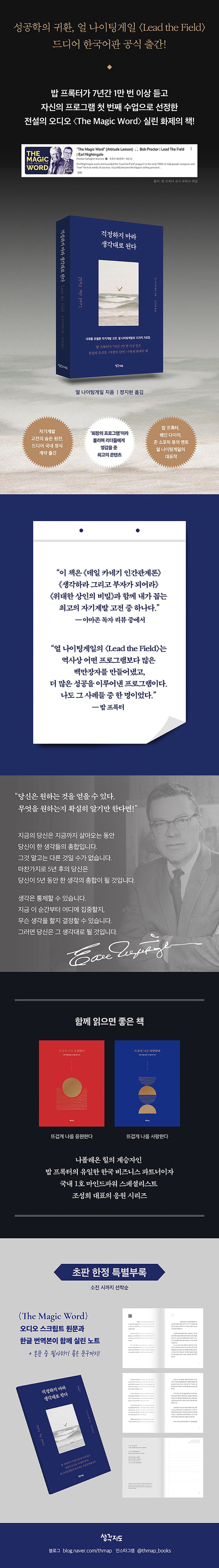 20세기 최고의 동기부여 연설가이자 작가인 얼 나이팅게일의 《걱정하지 마라 생각대로 된다》가 출간되어 화제다. 이 책은 밥 프록터가 7년 동안 1만 번 이상 들으며 자신의 프로그램 첫 번째로 구성한 전설의 오디오 〈마법의 단어〉가 실린 책으로도 유명한데, 이번에 나이팅게일-코넌트 그룹과 정식계약 후 국내에 처음으로 선보이게 되었다.