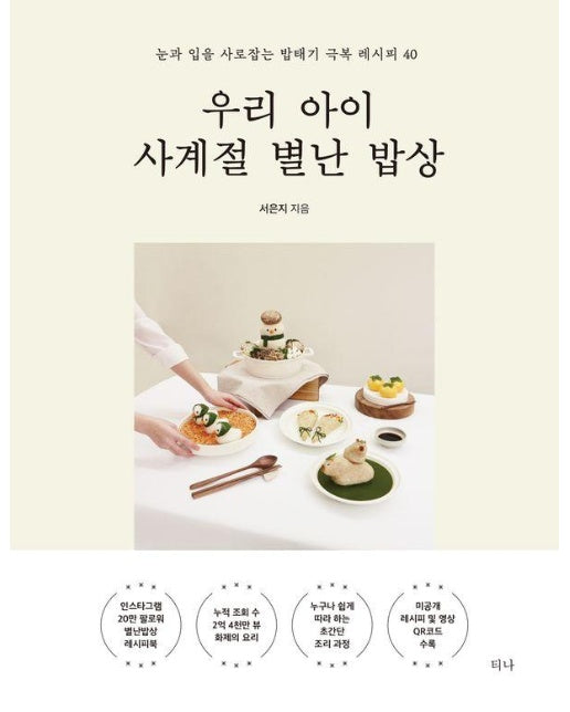 카피바라시금치카레,수박바토스트,눈사람버섯전골누적조회수2억4천만뷰별난밥상의첫번째레시피북!무궁무진한아이디어의원천이궁금해지는레시피를공유하는계정별난밥상의첫번째책이티나에서출간되었다.3575만조회수를기록한‘카피바라시금치카레’레시피는물론,만우절을즐겁게만드는‘고등어밥’,여름간식으로안성맞춤인‘수박바토스트’,노루궁댕이버섯의진가를확인할수있는‘눈사람버섯전골’까지20만팔로워가열광하는인기요리40가지를담았다.공유하는레시피마다조회수가폭발하는별난밥상에게는‘요리계의스티브잡스’라는별명이어색하지않다.재료본연의맛을강조해풍미를살리면서도제철재료를적극활용하고,그시즌에만느낄수있는특별한이벤트를놓치지않기때문이다.한그릇에담긴창의력은탐이날정도다.화려한플레이팅에주눅들기쉽지만레시피는결코복잡하지않다.누구나쉽게따라할수있도록조리과정을단순화했으며최초로공개하는레시피를제외한모든레시피에영상QR코드를수록했다.즐거운상상이요리가되는특별한시간사계절이맛있어지는별난밥상레시피“잘먹이려고시작했던캐릭터밥상이일상을담는일기장,특별한날과계절을느낄수있는달력이되었어요.”별난밥상이사랑받는이유는통통튀는아이디어가돋보이는레시피덕분이기도하지만요리를통해드러나는뚜렷한계절감덕분이기도하다.시의적절한제철재료를아낌없이활용해열두달식탁을완성하는별난밥상.그의손을거치면명절음식은어느새색동옷을걸친꼬치전으로,담백한소시지파스타는여름바닷속문어로,충무김밥은핼러윈을장식하는유령으로재탄생한다.계절의흐름에따라구성된목차를참고해사계절요리를만들면자연스럽게해가기울고달이차는것을느낄수있다.계절의맛과캐릭터의멋을살린레시피는밥태기(아이가특정시기에밥을거부하거나식사에흥미를잃는현상)를겪는아이는물론,왠지입맛이없는어른도식탁으로불러모은다.《우리아이사계절별난밥상》에는어른과아이가한자리에서즐길수있도록단란한식탁을만드는Tip을곳곳에수록했다.별난밥상의꿀같은Tip은요리가서툰초보자에게는살가운가이드가,그의레시피를참고해재해석하고싶은사람에게는최고의레퍼런스가될것이다.또한사철누드제본방식으로제작해식탁위에서활짝펼쳐두고볼수있도록만듦새에도공을들였다.책속에서잘먹이려고시작했던캐릭터밥상이일상을담는일기장,특별한날과계절을느낄수있는달력이되었어요.캐릭터요리는매일의평범한밥상을특별하게만들어줍니다.주변에흔히보이는식재료로완성하는예쁘고재미있는음식덕분에아이들은밥먹는시간이기다려지고즐거워질거예요.---p.53월1일,삼일절은한민족이일본의식민통치에항거하고한국의독립의사를세계만방에알린날입니다.숭고한이날을되새기며비빔밥에태극기와무궁화를담았어요.---p.18무더운여름에가장먼저떠오르는간식은아이스크림이죠.아이스크림인척하는밥도그를소개합니다.녹아서흘러내리는아이스크림을치즈로표현했어요.모양때문일까요?먹다보면더위가싹가신답니다.---p.56영양소가풍부한멸치와고소한땅콩으로만든주먹밥을체다치즈로코팅해요.가을을대표하는과일단감이완성됩니다.주먹밥6개를만들어추석선물세트처럼표현했어요.이번추석에는단감주먹밥으로마음을표현해보면어떨까요?---p.106눈내리는겨울날에는뜨끈한전골이제격이죠.갖은버섯을듬뿍넣고보글보글끓이며먹다보면몸도마음도따뜻해집니다.든든한한끼식사로손색없는눈사람버섯전골이에요.---p.156