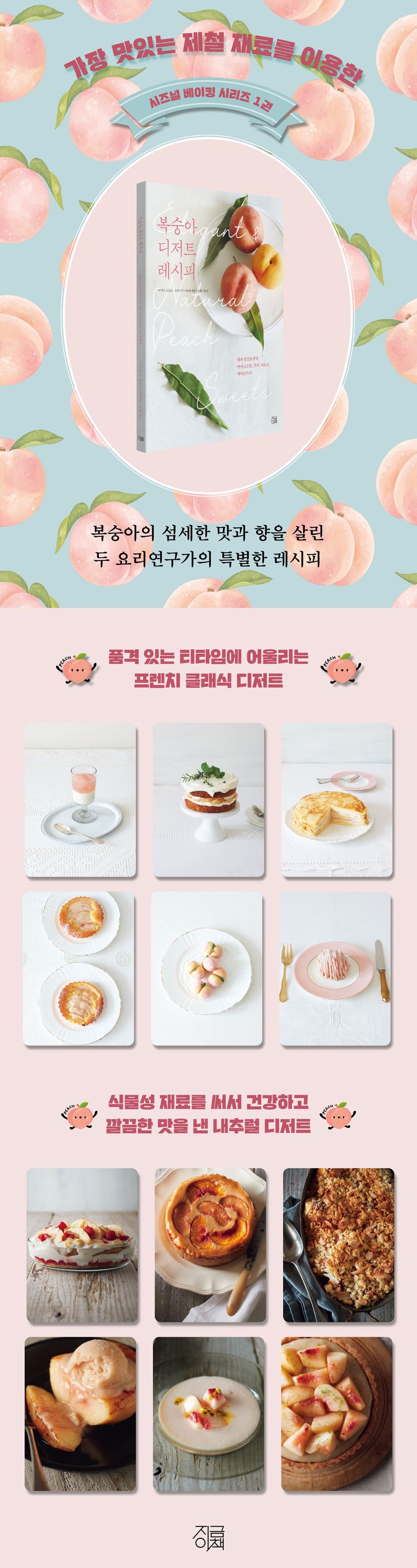 지금이책에서 새롭게 선보이는 ‘시즈널 베이킹’ 시리즈 첫 번째 책으로 《복숭아 디저트 레시피》가 출간되었다. 이 시리즈에서는 계절을 대표하는 한 가지 재료를 주제로 두 요리연구가가 각자 창의적인 레시피를 선보이는데, 정통 프랑스 제과를 공부한 저자 후지사와 가에데는 우아하고 품격 있는 클래식 디저트를, 비건 요리와 매크로바이오틱 식단으로 유명한 저자 이마이 요우코는 우유 ㆍ 달걀 ㆍ 백설탕을 과감하게 없앤 건강한 디저트를 소개한다. 첫 권인 《복숭아 디저트 레시피》는 만들기 쉽고 활용도 높은 잼과 콩포트부터 맛도 모양도 근사한 과자와 케이크, 초간단 음료와 아이스크림까지, 홈베이킹으로 만들 수 있는 복숭아 디저트를 가득 담았다.