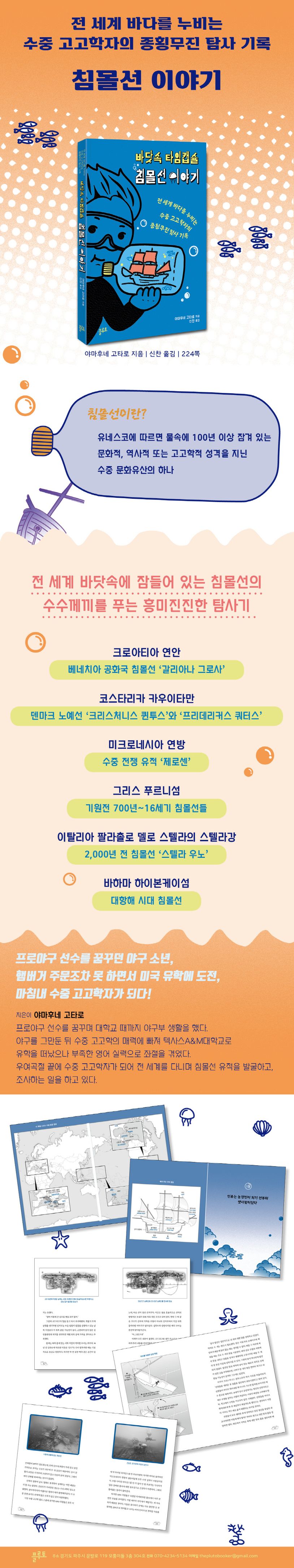 《바닷속 타임캡슐 침몰선 이야기》에는 저자가 발굴 조사에 참여했던 크로아티아의 베네치아 공화국 침몰선 갈리아나 그로사, 코스타리카의 덴마크 노예선이었던 침몰선 두 척, 바하마 하이본케이섬의 대항해 시대 침몰선 등 여섯 곳의 침몰선 유적 발굴 현장이 생생하게 담겨 있다.