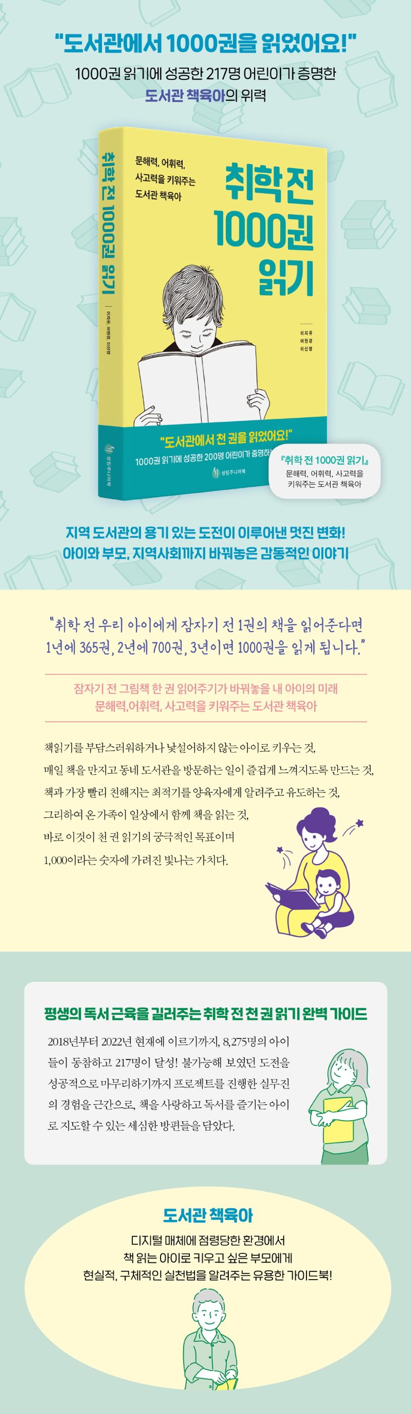 2018년 중랑구립정보도서관은 ‘취학 전 천 권 읽기’라는 명칭의 프로젝트를 시작한다. 취학 전 5~7세 아이들에게 책 1000권을 읽게 하자는, 얼핏 무모한 욕심이 느껴지는 선언. 어린아이들이 과연 1000권을 읽어내는 것이 가능하겠느냐는 우려와 기대 속에 시작된 사업은 그러나 무수한 시행착오를 거쳐 마침내 성공적으로 안착되기에 이른다. 이 책은 사업의 완결에 이르기까지의 우여곡절과 그 와중에 닥친 코로나19라는 초유의 사태에서도 소신과 믿음을 관철시켜 프로젝트를 성공시키기까지, 사업을 진행한 사서들의 4년여에 걸친 고군분투를 담았다. 또한 천 권 읽기를 달성한 아이와 부모들의 생생한 후기, 매일매일 ‘독서 경험’을 쌓음으로써 달라진 아이들의 변화도 실려 있다. 디지털 매체에 점령당한 환경에서 내 아이를 책 읽는 아이로 키우고 싶은 부모·양육자라면, 막연한 바람을 현실적이고 구체적으로 실천할 수 있도록 도와줄 유용한 가이드북이다.