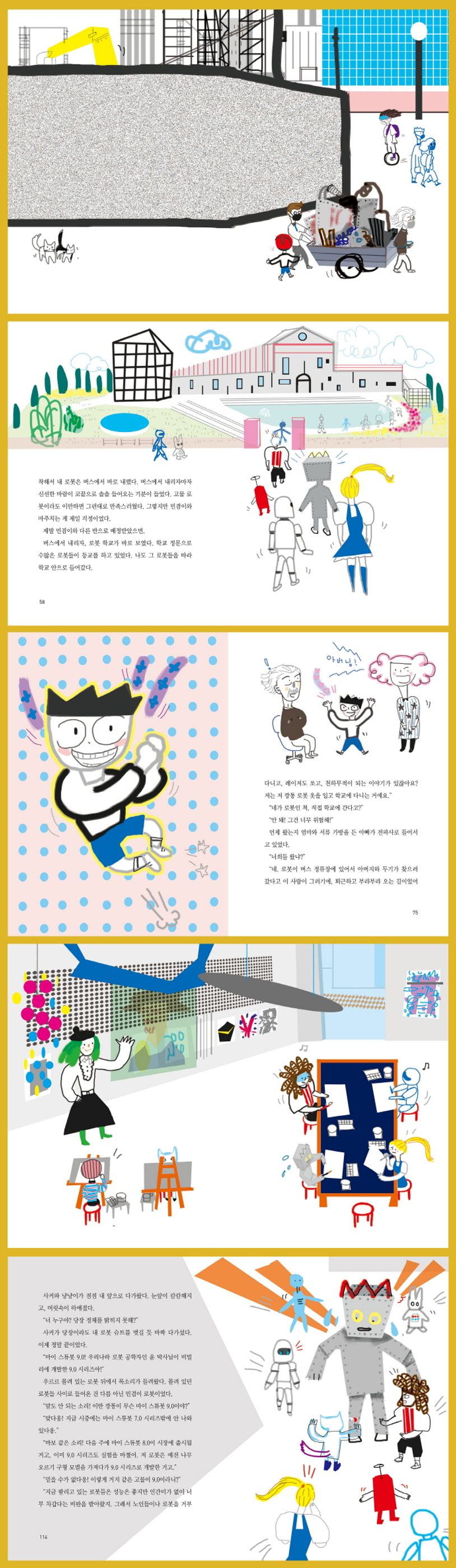 “로봇학교에가면집에만안틀어박혀있어도된대요.학교도매일매일갈수있고,체육시간엔진짜운동장에서축구도하고,티볼이라는것도한대요.친구들이랑같이놀수도있고,어깨동무도할수있고요!”