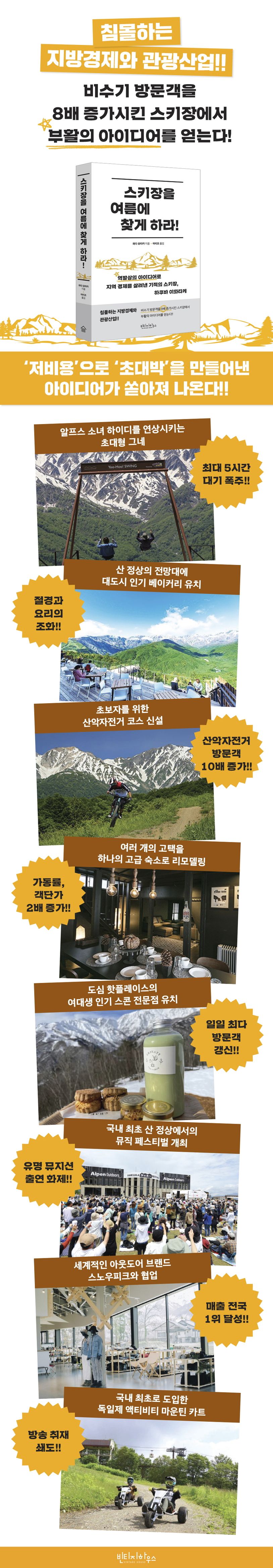 《스키장을 여름에 찾게 하라!》는 인구감소와 기상이변으로 겨울 시즌 스키장 방문객이 급감하자, 각종 아이디어를 쏟아내어 스키장은 물론 지역 경제까지 살려낸 기적의 스키장 ‘하쿠바 이와타케’의 이야기를 담고 있다.