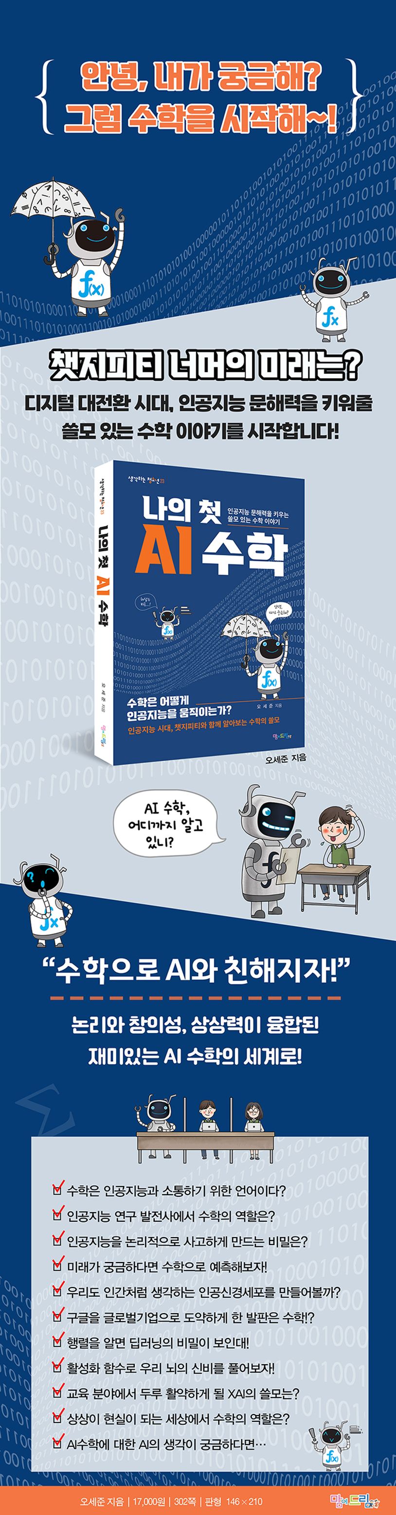 하루하루 무섭게 성장하는 AI, 즉 인공지능은 우리 삶 속으로 점점 더 깊숙이 스며들고 있다. 특히나 챗지피티 등 생성형 인공지능의 놀라운 성능은 한편으론 불안감과 위기감마저 고조시킨다. 예컨대 조만간 인간의 일자리가 사라질 것이라든가, 각종 범죄에의 악용 가능성 등 인공지능 관련 이슈가 사회문제로 떠오른 것이다. 이런 때일수록 인공지능의 실체를 올바로 알고 지혜롭게 활용할 수 있는 인공지능 문해력, 유연한 문제해결력을 높이는 수학적 사고 등이 필요하다. 앞으로 인류는 다양한 주요 의사결정에서 인공지능과 협력하며, 일상생활에서도 상당 부분을 인공지능에 의지하게 될 것이기 때문이다. 이 책은 수학의 관점에서 인공지능의 메커니즘을 들여다보고, 수학의 언어로 인공지능과 소통하며 친밀해질 기회를 주고자 한다. 인공지능의 발전사는 물론 인공지능의 다양한 의사결정이나 문제해결 과정에서 수학이 어떤 역할을 하는지 다양한 사례와 함께 차근차근 설명한다. 디지털 대전환 시대에 꼭 필요한 문해력과 사고력을 키워줄 재미있고 쓸모 있는 수학 이야기들을 만나볼 수 있을 것이다.