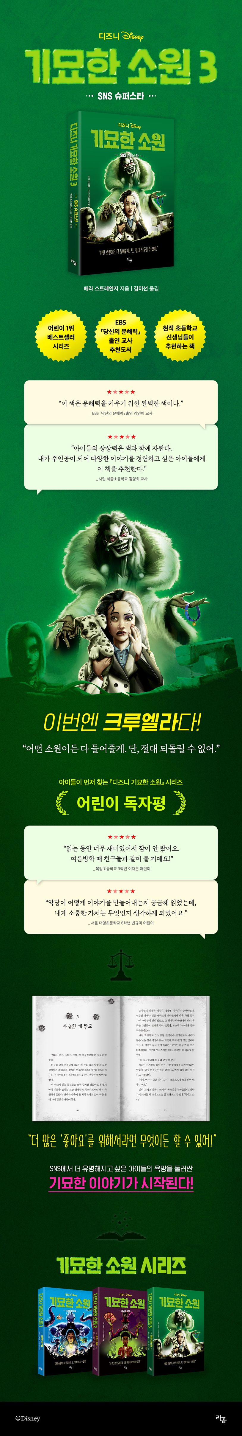 EBS 「당신의 문해력」 출연 교사가 강력 추천하고, 초등학교 선생님들이 추천하며, 사립초 아이들이 함께 읽는 책! 디즈니 오리지널 노블 『디즈니 기묘한 소원』 시리즈는 미국 「스쿨 라이브러리 저널」이 추천하고 미국, 영국, 호주, 프랑스 등에서 출간되는 등 전 세계 아이들의 사랑을 받는 소설이다.