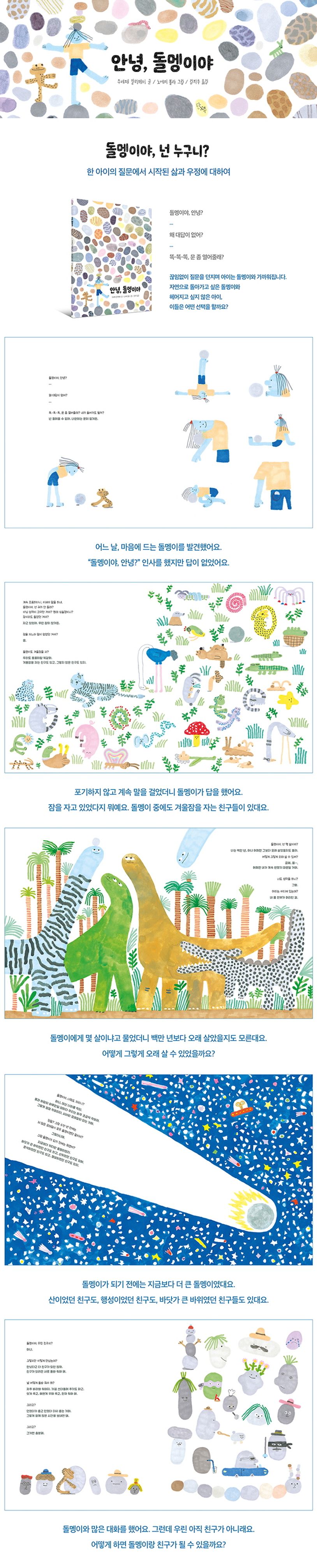 돌멩이를 발견한 아이가 돌멩이에게 말을 걸기 시작합니다. 한동안 답이 없던 돌멩이는 아이의 끊임없는 관심과 질문에 입을 열었습니다. 처음에는 짧게 답을 하던 돌멩이는 자신이 어디에서 왔고, 자신이 무엇을 좋아하는지에 대해 이야기하기 시작합니다. 돌멩이와 아이가 질문을 하고 답을 하면서 조금씩 가까워집니다. 아이와 돌멩이의 대화 속에서 친구과 되는 방법과 함께 삶과 관계에 대해 다시 생각하게 하는 그림책입니다.