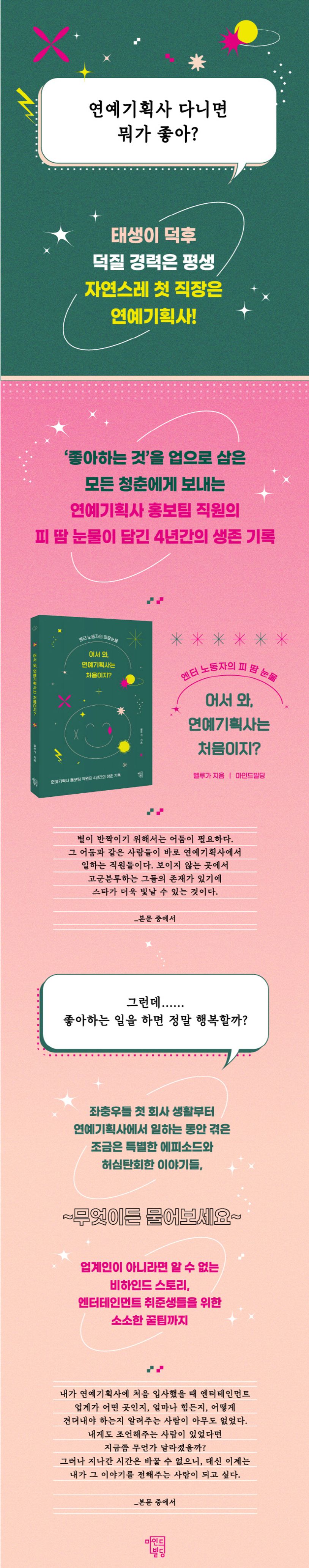 반짝반짝 빛나는 연예인과 빠르게 바뀌는 트렌드, 멀리서 보는 엔터테인먼트 업계는 그저 멋지고 화려해 보인다. 그러나 엔터테인먼트 업계란 바다 위에 뜬 유람선과 같다. 그리고 연예기획사의 직원은 유람선이 침몰하지 않도록 쉬지 않고 돌아가는 프로펠러이다. 온갖 파도에 휩쓸리거나 부서지지 않으려면 물밑에서 치열하게 움직이는 프로펠러의 역할이 중요하다. 연예기획사를 전전하는 동안 저자는 촬영부터 홍보, 콘텐츠 제작 및 보도자료 작성까지 다양한 일을 하며 경험을 쌓았다. 좌충우돌 첫 회사 생활부터 연예기획사에 일하는 동안 겪은 조금은 특별한 에피소드와 더불어 엔터테인먼트 업계를 희망하는 취준생들에게 도움 될만한 소소한 꿀팁까지 모두 담았다. 좋아서 시작한 일이지만 결국 포기하게 된 웃픈 업계 사정부터 업계인이 아니라면 알 수 없는 비하인드 스토리까지, 이 책을 읽다 보면 단순히 연예기획사에 대한 폭로나 경험담이 아닌 엔터테인먼트 업계에서 생존하기 위해 고군분투했던 저자의 솔직한 경험이 담겨 있음을 알게 된다. 엔터테인먼트 업계로의 취직을 준비하지 않더라도 사회에 첫발을 내디딘 초년생, 덕질 경험이 있는 사람이라면 공감과 위안을 느낄 수 있을 것이다.