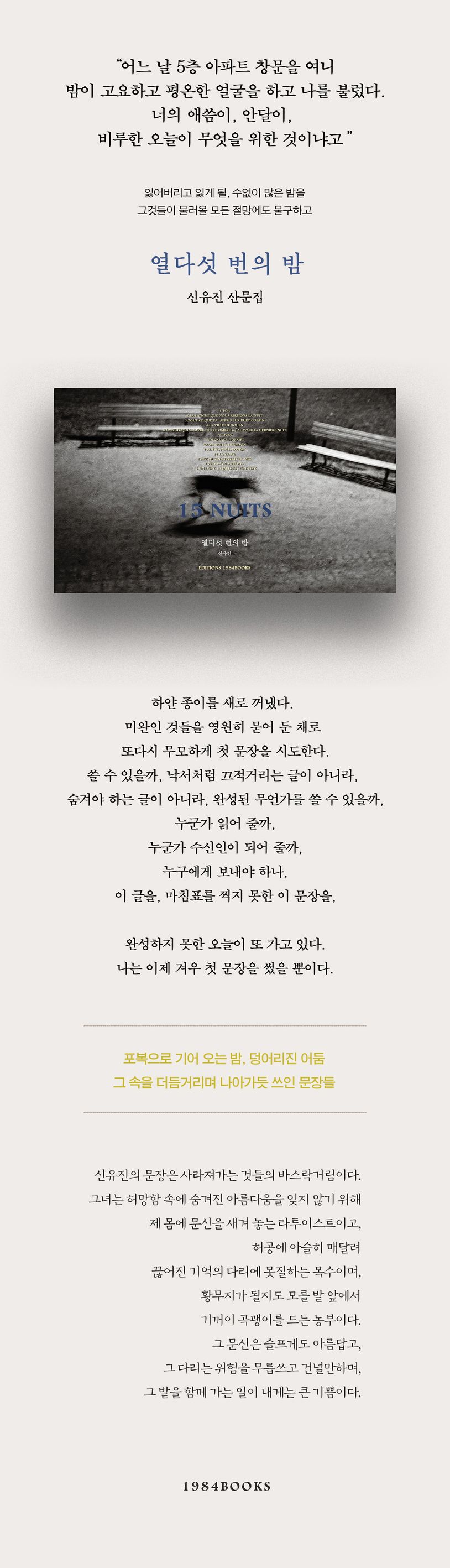 작가이자 번역가인 신유진의 첫 산문집 『열다섯 번의 밤』의 개정판이 출간되었다. 『열다섯 번의 낮』에서 화려한 빛에 가려진, 사라져가는 것들에 대한 허망함과 아름다움을 잊지 않기 위해 제 살에 문신을 새겨 놓는 타투이스트가 되었다면, 『열다섯 번의 밤』에서는 밤의 시간과 공간 속 기억들을 유령처럼 떠돌다 그것들 사이에 다리를 놓는 목수가 되었다.