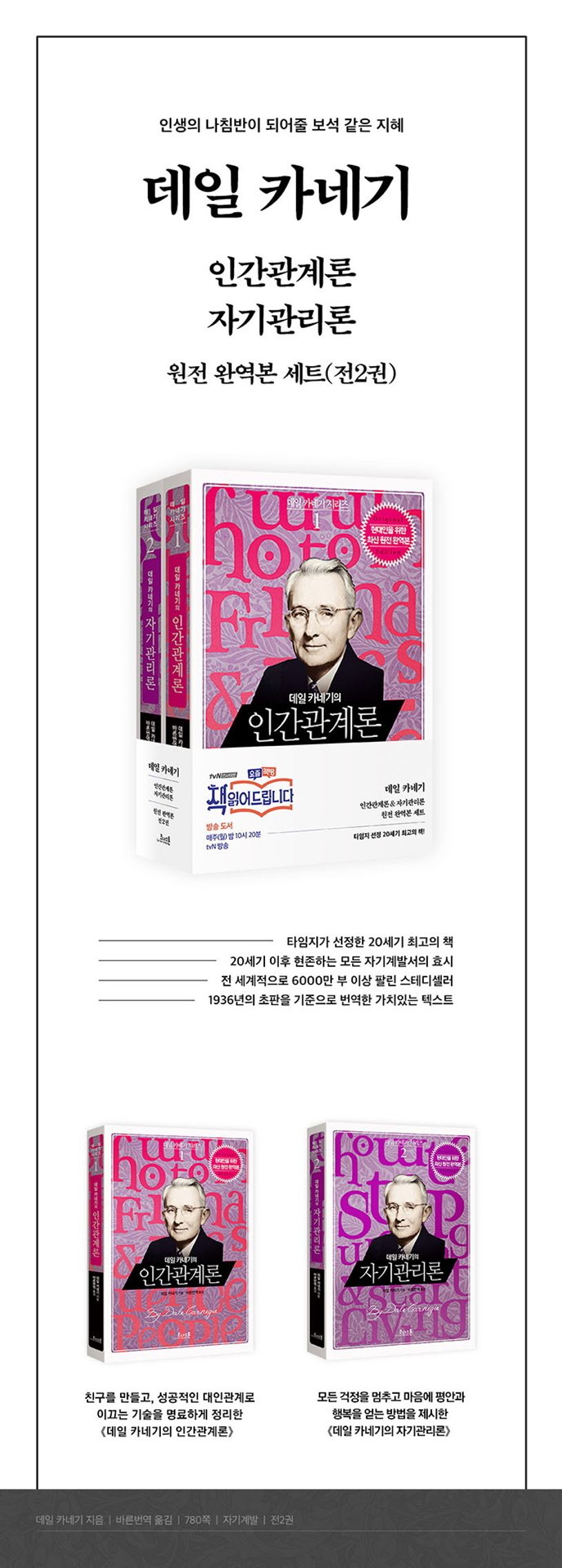 코너스톤은 〈데일 카네기 시리즈(전 5권)〉 중 대표작이라고 할 수 있는 2권을 묶어 《데일 카네기의 인간관계론 & 자기관리론 원전 완역본 세트》를 출간한다. 친구를 만들고, 성공적인 대인관계로 이끄는 기술을 명료하게 정리한 ‘데일 카네기의 인간관계론’과 모든 걱정을 멈추고 마음에 평안과 행복을 얻는 방법을 제시한 ‘데일 카네기의 자기관리론’의 완역본을 만나보자!