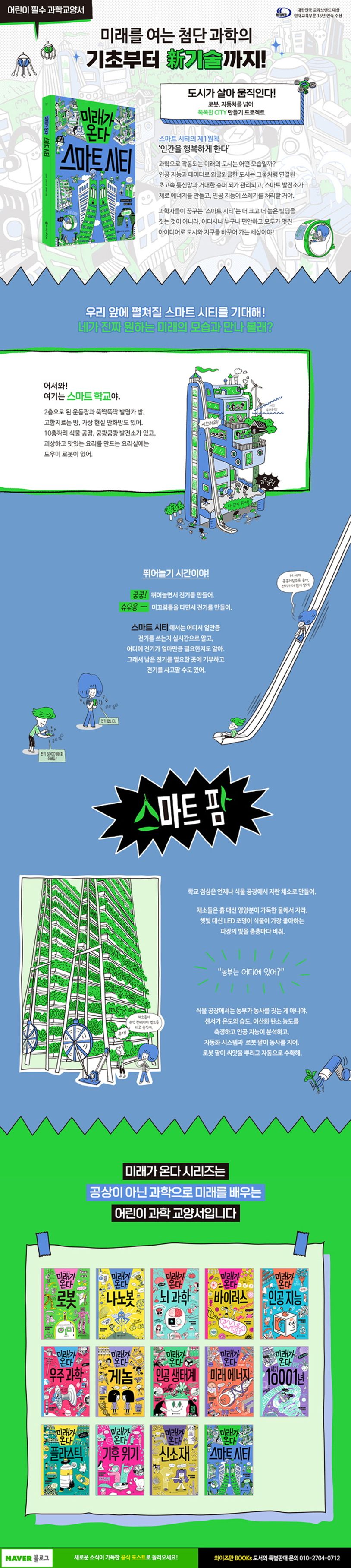 과학과 수학 분야 전문 출판사 와이즈만북스에서는 제4차 산업 혁명 시대를 맞이하여 미래를 바꿀 첨단 과학에 대한 키워드를 타이틀로, 첨단 과학의 시작부터 지금, 그리고 미래까지, 과정에 충실한 정보서 “미래가 온다” 시리즈를 기획하고, 14번째 책으로 《미래가 온다, 스마트 시티》를 출간했다. 자신들만의 문체로 어린이 과학 정보서의 대표 필자로 평가받는 김성화, 권수진 작가가 전권을 집필했다. 첨단 과학은 오래 전부터 쌓아 온 과학의 바탕 위에서 존재한다는 생각으로, 무엇보다 ‘기본에 충실한 첨단 과학서’로 풀어 냈다. 다소 생소하게 느껴질 수 있는 ‘첨단’ 소재지만 다양한 문제를 제기하고, 유도하고, 자연스럽게 답을 찾아내는 친절한 글쓰기 방식으로 정보서지만 재미있는 이야기책처럼 읽을 수 있다. 새로운 미래 과학 키워드로 구성된 “미래가 온다” 시리즈는 총 20권으로 《로봇》, 《나노봇》, 《뇌 과학》, 《바이러스》, 《인공 지능》, 《우주 과학》, 《인공 생태계》, 《게놈》, 《미래 에너지》, 《서기 10001년》, 《플라스틱》, 《기후 위기》, 《신소재》, 《스마트 시티》, 《매직 사이언스》(근간), 《바다》(근간), 《탄소》(근간), 《미래 식량》(근간), 《초지능》(근간), 《멸종》(근간) 등이며, 2022년 완간 예정이다.