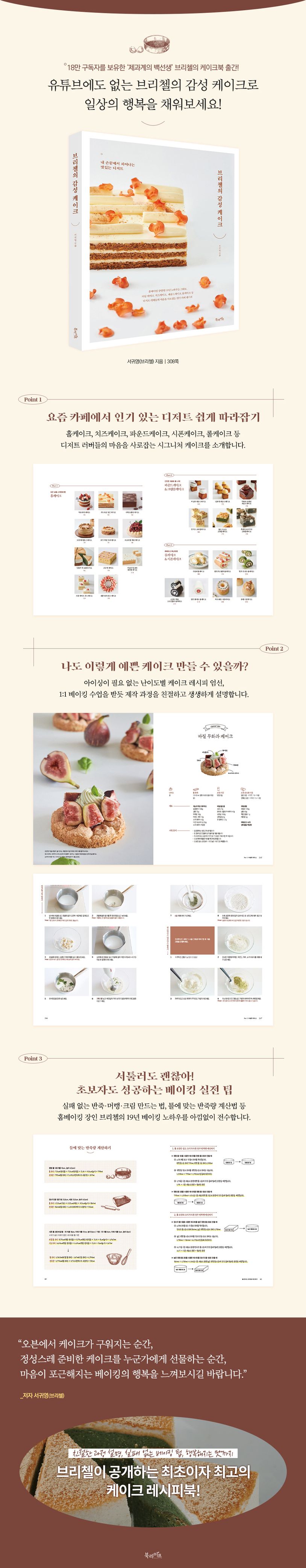 『브리첼의 감성 케이크』에는 블로그와 유튜브에 공개하지 않은 케이크 33개와 황금 비율, 실전 베이킹 비법이 담겨 있다. 구하기 쉬운 재료, 만드는 과정이 까다롭지 않은 레시피, 아이싱이 필요 없는 케이크. 이 세 가지 조건에 맞는 케이크로만 구성된 점이 돋보인다. 무엇보다 요즘 유명 카페와 베이커리 숍에서 인기 있는 케이크와 따라 만들기 쉬우면서 맛있고 트렌디한 디자인을 입힌 케이크를 담았다. 과일, 곡물, 구황작물, 초콜릿, 견과류 등 여러 재료를 활용한 홀케이크부터 치즈케이크, 파운드케이크, 롤케이크, 시폰케이크는 물론 저자 브리첼의 개성이 담긴 케이크까지 알차게 소개한다. 한 가지 메뉴를 완성하면 다른 재료를 넣어 새로운 버전의 케이크로 응용할 수 있도록 했다. 아이싱을 하지 않아도 되는 케이크 레시피가 궁금한 홈베이커와 예쁜 케이크를 완성도 있게 만들어 보고자 하는 이들, 카페 창업을 염두해 두고 레시피를 개발하고 싶은 모두를 위한 책이다.