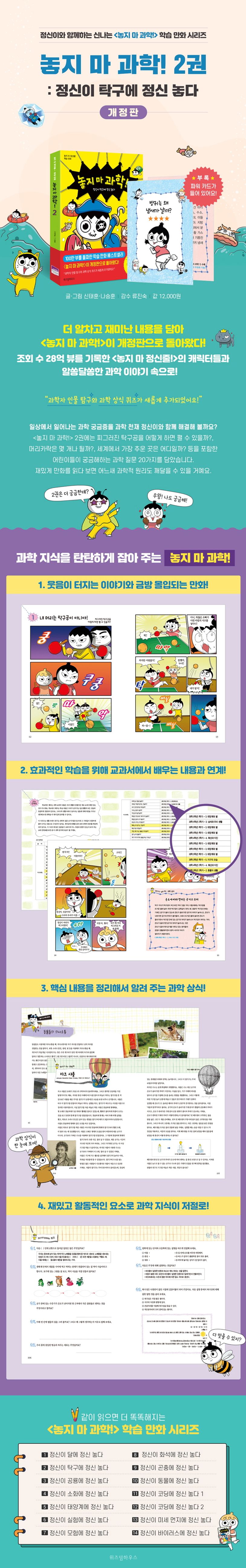 이 인기에 힘입어 2016년 출시된 〈놓지 마 과학!〉 학습만화 시리즈는 출간되자마자 베스트셀러에 오르며 열 번 넘게 반복해서 읽었다는 리뷰와 더불어, 다음 권 출간을 기다리는 독자들의 독촉이 쇄도할 만큼 반응이 뜨거웠다. 총 14권까지 출시되었는데, 권수가 늘어날수록 다른 책은 몰라도 이 책만은 꼭 본다는 충성도 높은 어린이 독자들의 수가 점점 늘어 갔다. 초등학교 교과 과정을 기반으로 한 다양한 과학적 질문들을 기발하고 재미있게 풀어내어 자연스럽게 과학에 재미를 붙이고 그 원리를 이해하게 만들어준다. 이번 〈놓지 마 과학!〉 개정판은 새로운 과학 교과서의 체계에 맞추어 교과 단원을 정리한 ‘교과 연계표’, 심화 학습인 과학자의 인물 탐구와 상식을 담은 페이지와 재미와 흥미를 유발할 수 있는 퀴즈까지 만나볼 수 있도록 구성되었다.