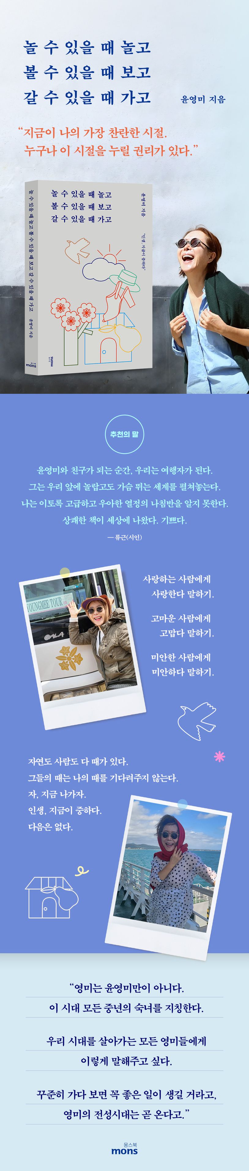 그러니 놀 수 있을 때 놀고, 볼 수 있을 때 보고, 갈 수 있을 때 가자는 것. 봄꽃도 때를 미루면 영영 못 보고 내년에도 꽃은 피겠지만 나의 내년도 장담할 수는 없다. 저자는 궁금하면 바로 가보고, 보고 싶은 사람은 다음 주에 만날 약속이 있어도 오늘 또 본다. 농담인 듯 가볍게 건네는 말 같지만 솔직 담백한 문장을 따라 읽으며 어느새 마음이 이끌린다. 특유의 리드미컬하고 유쾌한 화법으로, 읽은 사람의 마음에 콧바람을 살살 불어넣는다.