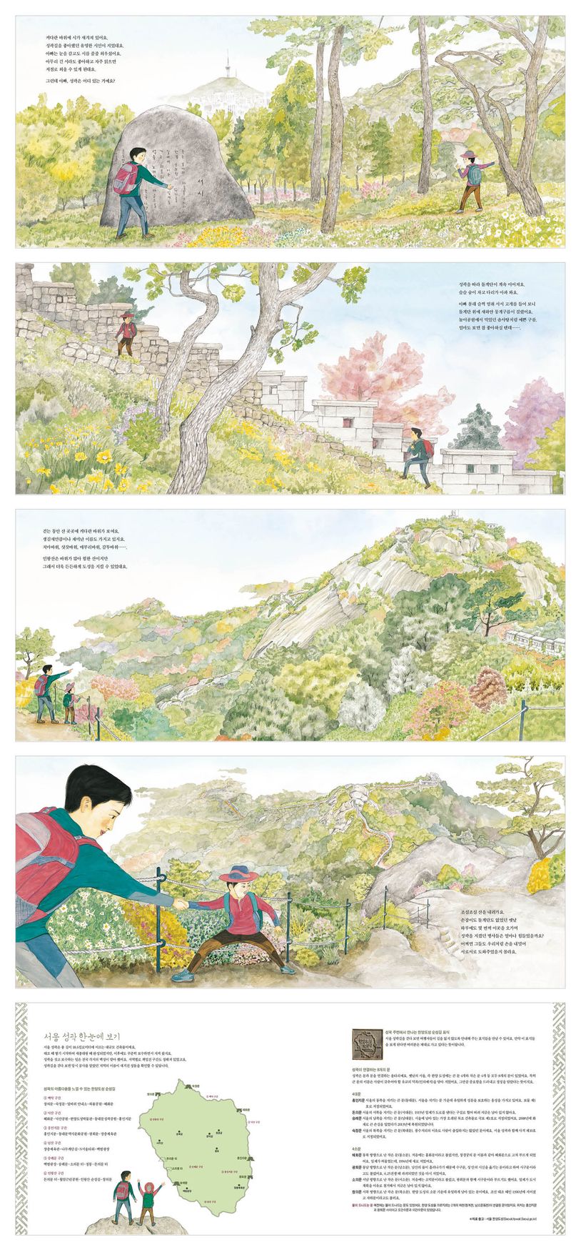 공간적으로는 창의문에서 시작하여 인왕산 정상을 오른 후 돈의문 방향으로 내려오는 코스를 담고 있는데, 아이가 아빠와 함께 걸으며 성곽길이 주는 여러 의미에 대해 차츰 깨닫는 내용의 흐름으로 구성했습니다. 성곽 자체가 주는 풍경을 통해 시간의 경과를 알려주는 석벽에 대한 정보를 얻고, 성곽의 내부로 보이는 궁과 도시를 통해 옛 도성 안팎의 역사를 배우고, 길을 지나며 만나는 풍경 속에서 풀과 나무, 꽃과 곤충 등 자연의 아름다움도 만끽합니다.