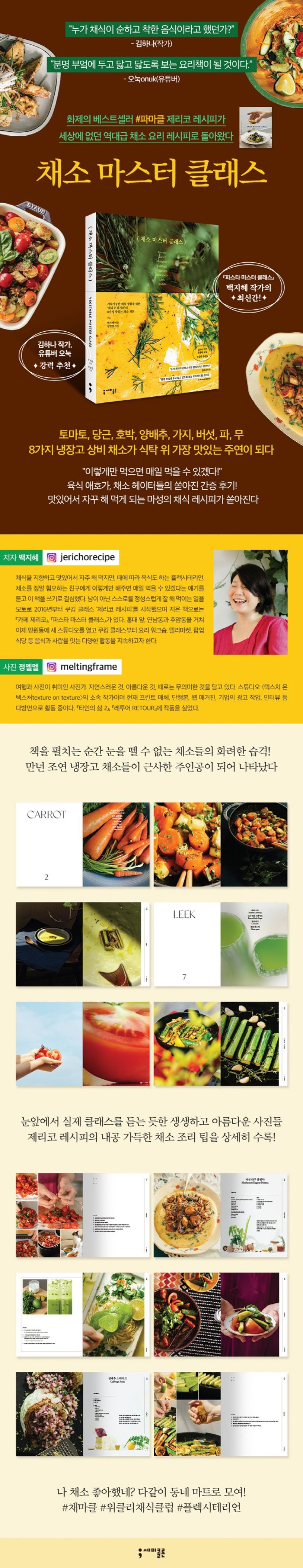 동시대 가장 주목받는 사진가 정멜멜의 특별한 협업 또한 반드시 이 책을 소장해야 하는 또 하나의 이유다. 특별한 시선으로 담아낸 채소들의 면면이 진한 잔상을 남기며, 기존 요리책에서 쉽게 보지 못한 섬세하고 아름다운 과정 사진들로 우리가 생각했던 채소 요리의 상식을 180도 뒤집는다. 동시대 트렌드에 기민하게 발맞춰 지금 우리에게 꼭 필요한 요리책만을 엄선해 온 세미콜론에서 처음 출간되는 채식 레시피북이라는 점도 주목할 만하다. 출간 소식만으로도 연일 SNS에서 화제가 될 만큼 수많은 팔로워가 기다린 화제의 채소 마스터 클래스, 지금 바로 만나 보자.
