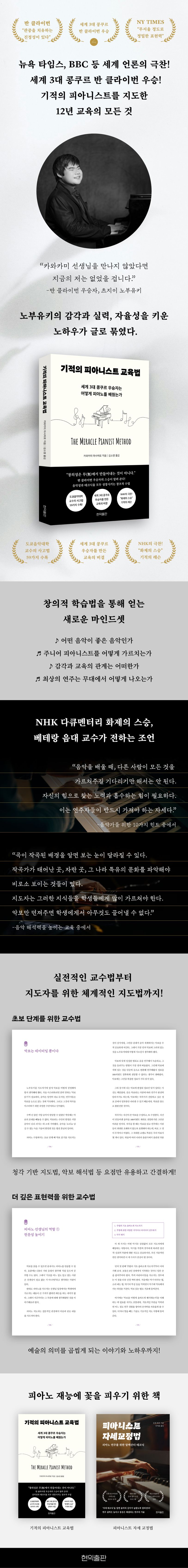 임윤찬과 츠지이 노부유키. 최근 국제 콩쿠르를 통해 두 피아니스트는 각기 다른 방식으로 음악의 깊이를 입증했다. 한 명은 경이로운 해석력으로, 다른 한 명은 섬세한 표현력으로 관객의 감정을 움직인다. 하지만 그들에게는 공통점이 있다. 어린 시절부터 뛰어난 흡수력과 해석력을 바탕으로 실력을 쌓아왔으며 그 배경에는 ‘어떻게 가르칠 것인가’를 깊이 고민한 좋은 선생의 전략적 교습법이 있었던 것. 《기적의 피아니스트 교육법》은 제13회 반 클라이번 국제 피아노 콩쿠르 우승자 츠지이 노부유키를 6세부터 12년간 지도한 것으로 스승 카와카미 마사히로의 실제 수업 방법을 집대성한 책이다. 세계 6개 도시 예선을 통과한 29명의 경쟁자를 제치고 미국 최고 권위의 피아노 콩쿠르에서 우승할 수 있었던 노부유키의 창의성과 자율성은 좋은 교육의 결과였다. 노부유키를 가르친 저자 카와카미 마사히로는 빈 시립음악예술대학을 수석 졸업했고, 유럽과 일본을 오가며 수많은 연주자와 교사를 길러낸 피아니스트이자 교수다. 기교 중심이나 암기식 교육에서 벗어나 음악적 자율성과 표현력을 핵심에 두는 새로운 교수법을 실천해 온 저자가 이 책을 사고력을 자극하고 학생 스스로 음악을 해석하고 표현하게 만드는 방법을 제시한다.