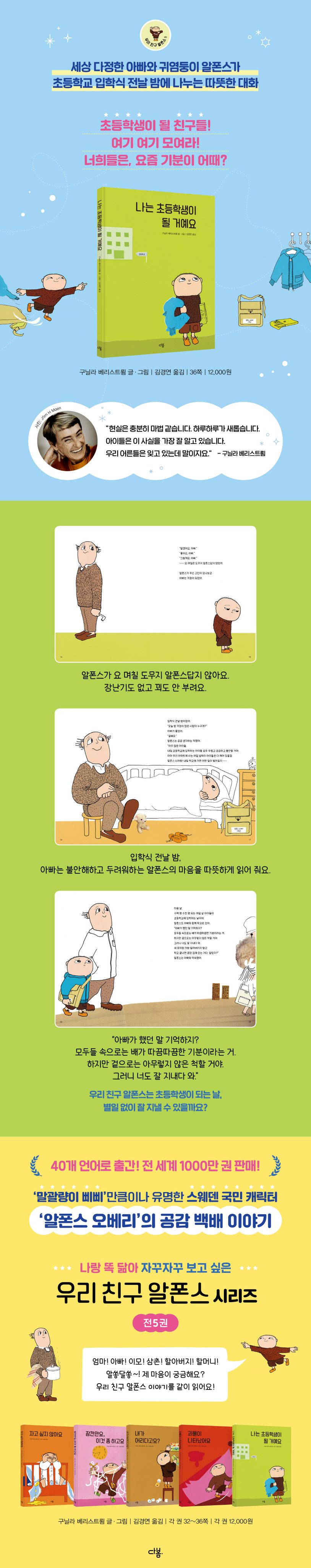 초등학생이 된다는 건 아이들에게 어떤 의미가 있을까요? 어떤 아이들에게는 알폰스처럼 ‘나는 초등학생이 될 거야’라고 비장하게 선언할 정도로 엄청나게 큰 사건으로 다가오지는 않을까요? ‘우리 친구 알폰스’ 시리즈의 다섯 번째 이야기 《나는 초등학생이 될 거예요》는 초등학교 입학을 앞두고 불안하기도 하고 걱정도 많은 알폰스와 그런 아들의 마음을 알아차리고 따뜻하게 다독이는 아빠의 이야기를 담고 있습니다.