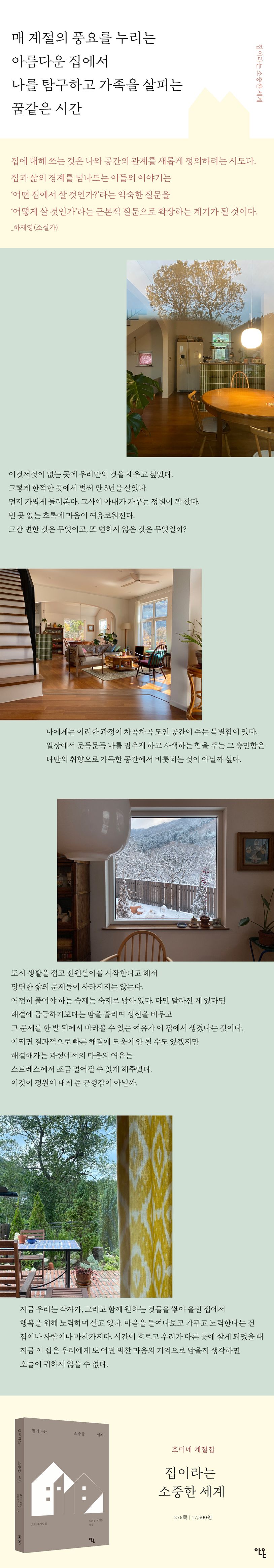 하루 중 가장 지치고 힘든 순간 우리는 불현듯 ‘아, 집에 가고 싶다’고 내뱉게 된다. 집이란 모름지기 나를 가장 편안하게 쉬게 하는 공간이기 때문이다. 더불어 그 집이 더 아늑하고 멋진 공간이 되기를 꿈꾸는 일은 삶의 활력을 더해준다. 여기 그 꿈을 실현한 사람들의 이야기가 있다. 2021년 인테리어플랫폼 〈오늘의집〉 올해의 집으로 선정되고, 서울 바깥의 삶을 찾아 보여주는 Jtbc 〈서울엔 우리집이 없다〉에 소개되며 화제가 되었으며, 각종 광고에서 아름다운 ‘집’의 배경이 되기도 했던 김희경, 이지훈 부부의 계절을 품은 집과 그 집에서 자연과 더불어 사는 모습을 담은 책 《집이라는 소중한 세계》가 안온북스에서 출간되었다.