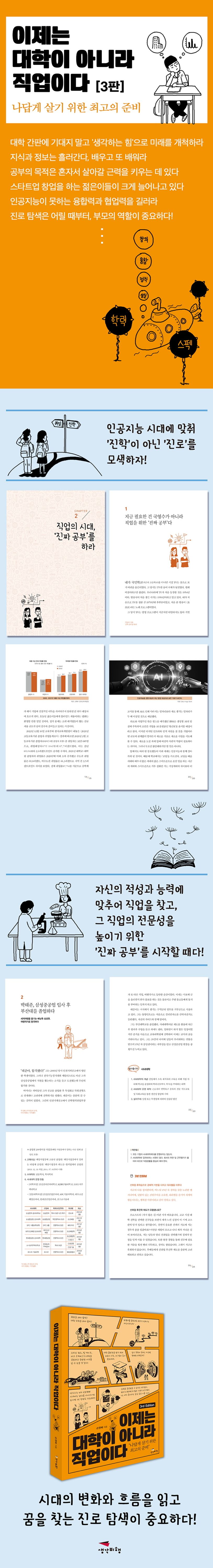 《이제는 대학이 아니라 직업이다》[3판]은 각종 교육 통계를 전면 개편하고, 생성형 인공지능의 등장에 발맞춰 관련 내용을 수정했을 뿐만 아니라 취업과 진학이라는 두 마리 토끼를 움켜잡은 제자들의 사례 또한 현재 시점에 맞춰 개정했다. 각자 적성을 발휘할 수 있도록 진로상담을 해주어 다양한 진로를 선택한 학생들의 근황을 재확인할 수 있다. 저자는 제자들의 실제 삶을 근거로 다가오는 미래의 직업 세계에 대한 준비는 ‘진학’이 아니라 ‘진로’라는 생각을 다시 한번 강조한다.