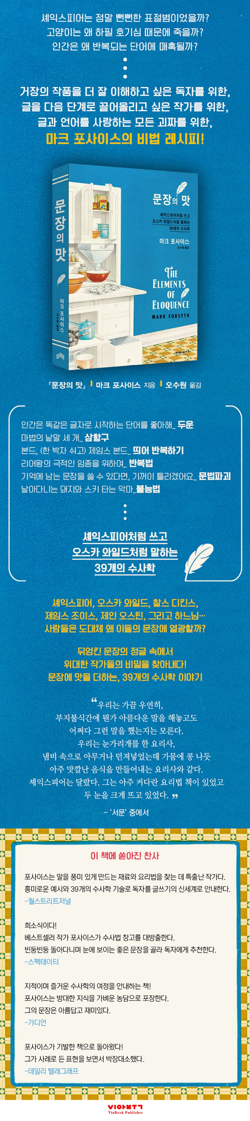 포사이스는 위대한 고전, 정치 연설, 영화 대사, 광고 문구 등 다양한 표현을 예시로 들면서, 문장의 맛을 더해주는 수사학의 비밀 레시피를 공개한다. 39개의 수사학 레시피를 접하고 나면 기억에 남아 사람들 사이에 회자되는 원리를 터득할 수 있을 것이다. 그리고 무엇보다 동서고금 다양한 표현과 포사이스의 능청맞은 글을 읽어내려가다 보면 참다운 ‘문장의 맛’을 느낄 수 있을 것이다.