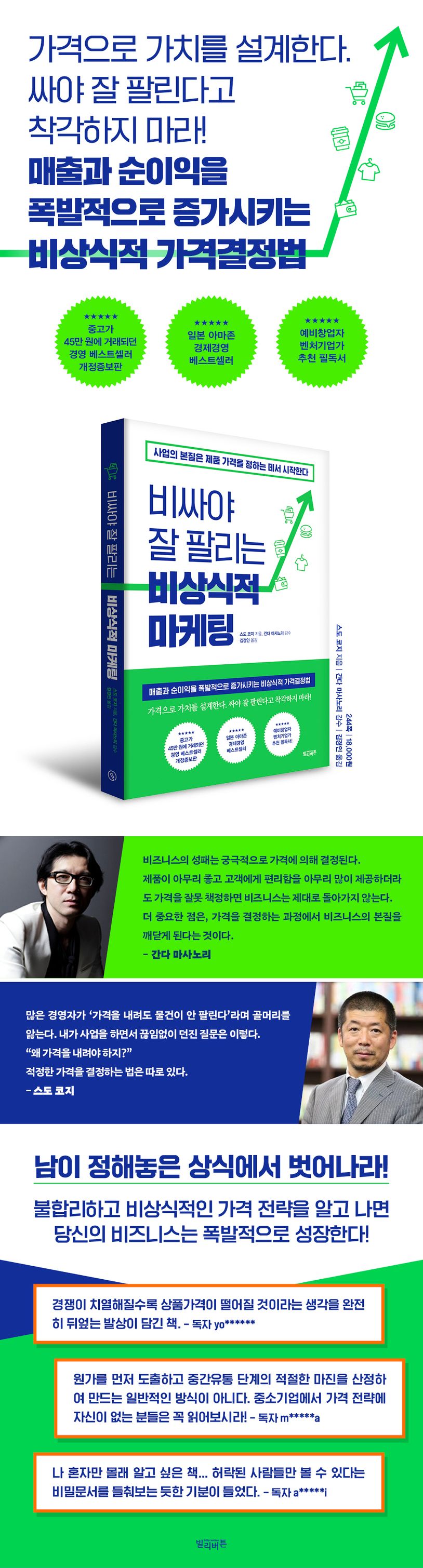 ‘연쇄 창업가’로 유명한 저자는 회사 자체가 브랜드가 되는 것, 즉 브랜드를 만드는 힘을 확보하는 방법은 가격 전략을 통해 가능하다고 말한다. 그가 말하는 가격 전략은 박리다매가 아니다. 가격이 비싸더라도 고객에게 최고의 제품을 제공하는 것이 최적의 가격 전략이다. 일반적으로 치열한 경쟁 무대에서 살아남기 위해 기업은 가격을 낮추는 경향이 있고 비즈니스계에서는 그것을 상식적이고 합리적인 전략으로 여기지만, 이 책의 저자는 ‘가격을 비싸게 매김으로써 고객에게 최고의 제품을 판매할 수 있다’라는 특별한 비결을 알려준다. 일본 최고의 비즈니스 전문가 간다 마사노리가 감수하고 추천한 《비싸야 잘 팔리는 비상식적 마케팅》은 1인기업가, 중소기업가, 예비창업자가 꼭 읽어야 할 책이다.