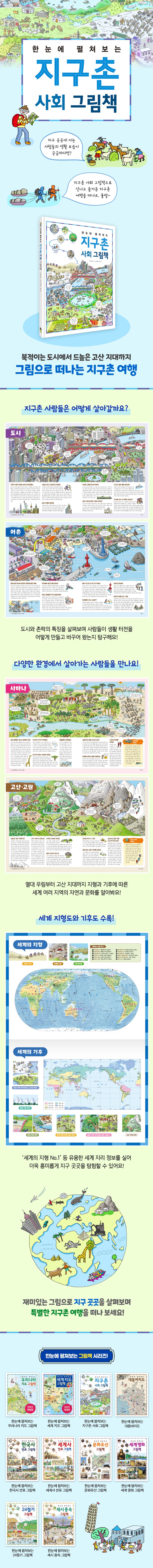 《한눈에 펼쳐보는 지구촌 사회 그림책》은 경제, 문화의 중심지 도시에서부터 해발 2천 미터 이상의 고산 지대까지 세계의 다양한 환경에서 살아가는 사람들의 생활 모습을 재미있는 그림과 이야기로 엮었습니다. 도시와 촌락의 특징을 살펴보며 사람들이 생활 터전을 어떻게 만들고 바꾸어 왔는지 탐구합니다. 열대 우림과 사막, 온대 지역, 극지방, 강과 바다, 고산 지대 등 지형과 기후에 따른 세계 여러 지역의 자연과 문화를 알아봅니다. 세계 지형도와 기후도를 함께 실어 어린이들이 지리학적 지식을 더욱 쉽고 흥미롭게 쌓을 수 있습니다. 재미있는 그림으로 지구 곳곳을 살펴보며 특별한 지구촌 여행을 떠나 보세요!