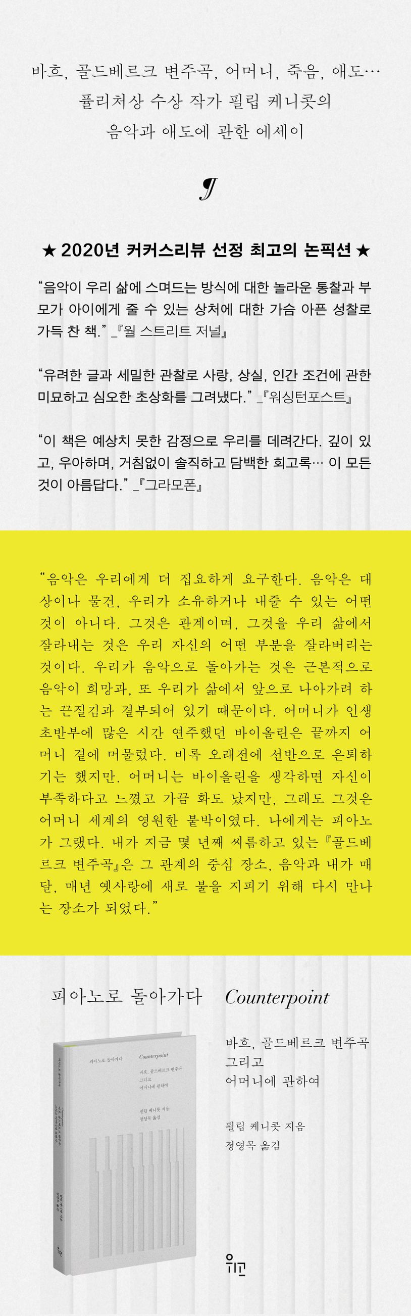 『워싱턴포스트』 예술 및 건축 평론가이자 퓰리처상을 수상한 작가 필립 케니콧의 『피아노로 돌아가다』는 어머니의 죽음 이후 5년에 걸쳐 바흐의 『골드베르크 변주곡』을 배우기 위해 헌신하는 음악적 여정과 어머니를 잃은 슬픔을 이해하고 넘어서려는 애도의 과정을 담고 있다. 이 작품의 원제이기도 한 ‘대위법Counterpoint’은 “두 개 이상의 선율을 선형적인 개성을 유지하면서 조화로운 관계를 맺도록 결합하는 기법”을 뜻하는데, 건반을 위해 작곡된 작품 중 가장 난해하고 심오한 작품 중 하나로 꼽히는 바흐의 『골드베르크 변주곡』을 이해하고 습득해가는 과정과 냉혹하고 가학적인, 하지만 사랑하는 음악을 공유했던 어머니와의 불행하고 복잡했던 관계를 이해해가고 이를 애도하는 과정을 대위법적인 구조 속에서 솔직하고 아름답게 풀어냈다.