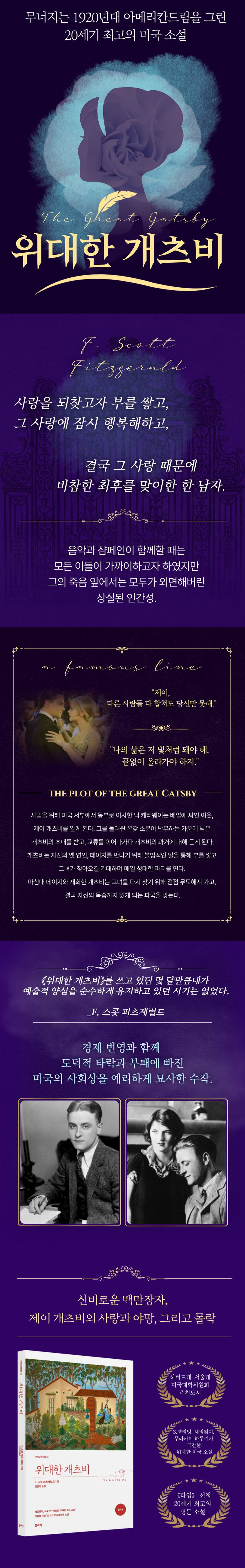 《위대한 개츠비》는 개츠비와 데이지 부부, 그리고 화려함을 탐닉하는 인물들을 통해 1920년대 재즈 시대가 가져왔던 화려한 번영과 그 뒤에 내재된 도덕적 해이, 상실된 인간성을 다루며 20세기 가장 위대한 미국 소설로 손꼽히고 있다.