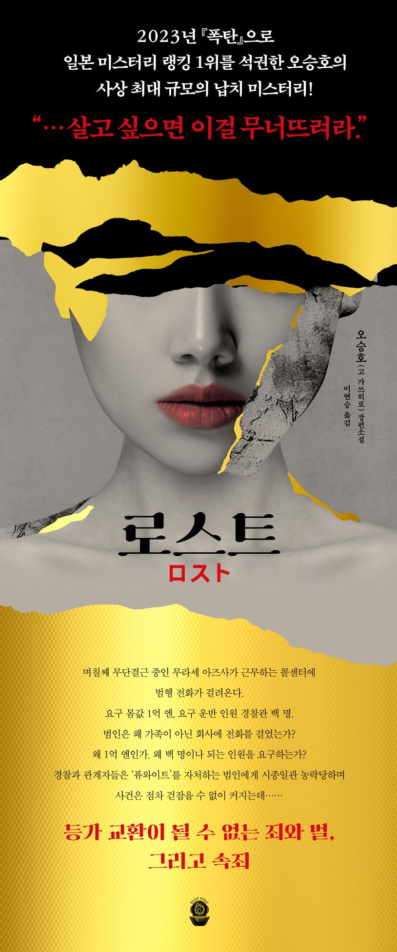 『로스트』는2015년『도덕의시간』으로재일동포출신작가최초로제61회에도가와란포상을수상하며화려하게데뷔한오승호작가가데뷔작출간후넉달만에선보인두번째장편미스터리다.이렇게단기간에신인작가의두번째작품이출간된것은매우이례적인일이다.게다가압도적인볼륨의장편납치미스터리라는점에서『로스트』는젊은작가의패기와작가를향한출판사의믿음,그리고도전정신을고스란히증명한작품이라고할수있습니다.또한여러가지매력적인요소들이작품곳곳에심어있다.대표적으로사건의배경이‘콜센터’라는점,범인이‘몸값1억엔,운반책으로경찰1백명’을요구한다는전대미문의설정,다양하고개성넘치는등장인물의사연등이그러하다.
