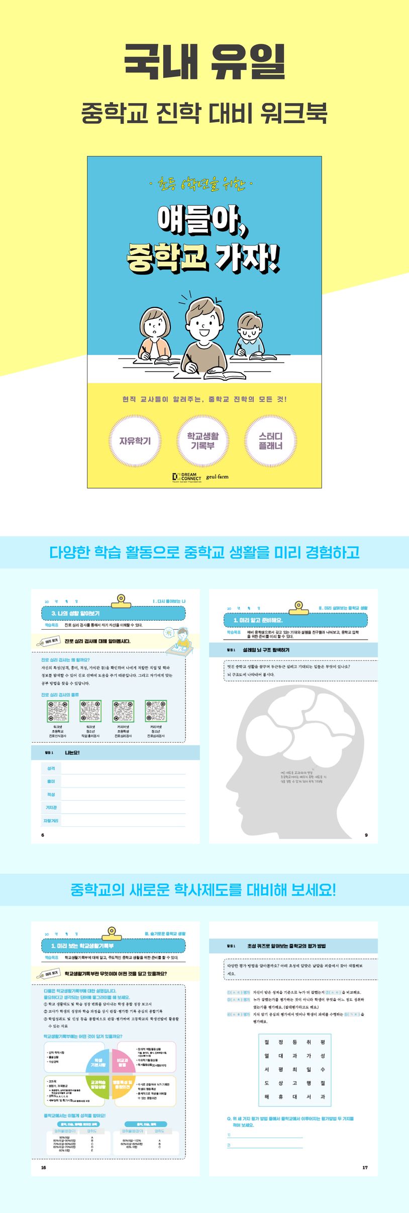 이 책은 중학교 입학을 앞둔 학생들이 6년간의 초등학교 생활을 마치고 마주하게 될 중학교 생활 전반에 관한 것을 미리 알아보고 이해하여, 두려움보다는 설렘과 기대를 안고 중학교 생활을 시작할 수 있도록 돕고자 개발되었습니다.
