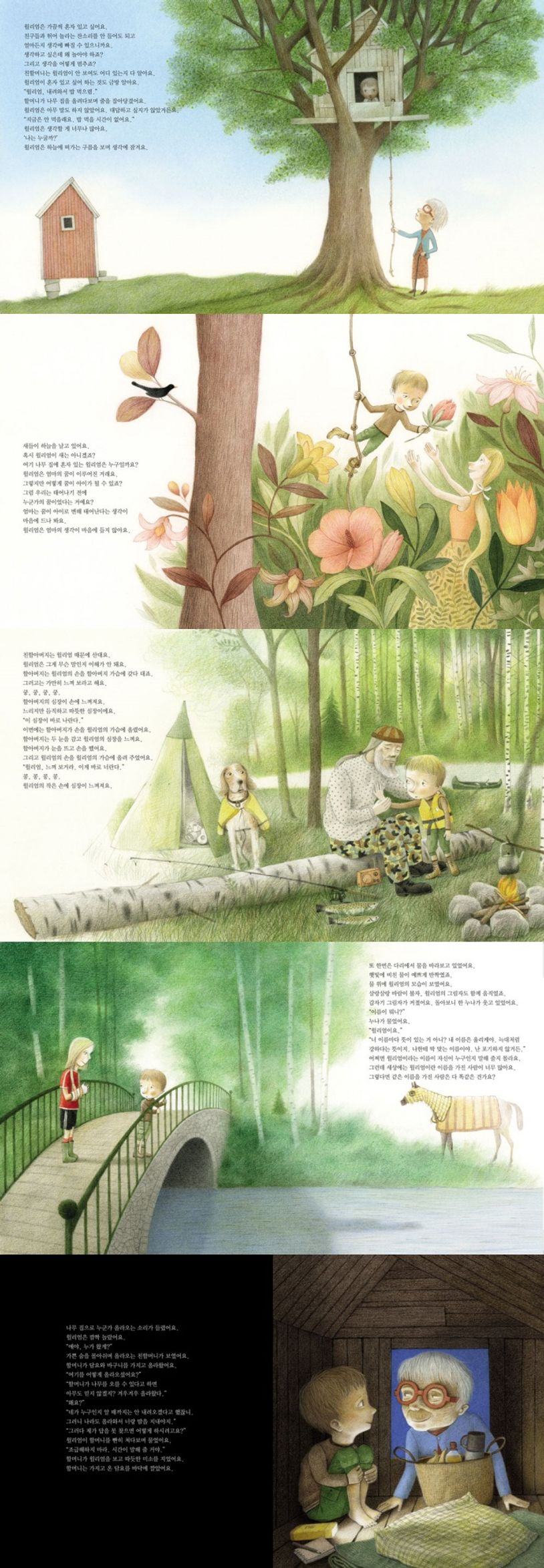 이 책의 삽화가 아킨 두자킨은 파스텔 톤의 서정적인 그림으로 아이가 보는 세상을 아름답고 잔잔하게 잘 표현하고 있습니다. 또 아이를 바라보는 가족의 마음도 함께 말이지요. 그림은 이야기가 펼쳐지는 내내 윌리엄의 마음에 인 작은 파장이 마치 통과 의례적인 건강한 흔들림이란 걸 알려주듯 푸르고 아름답습니다.