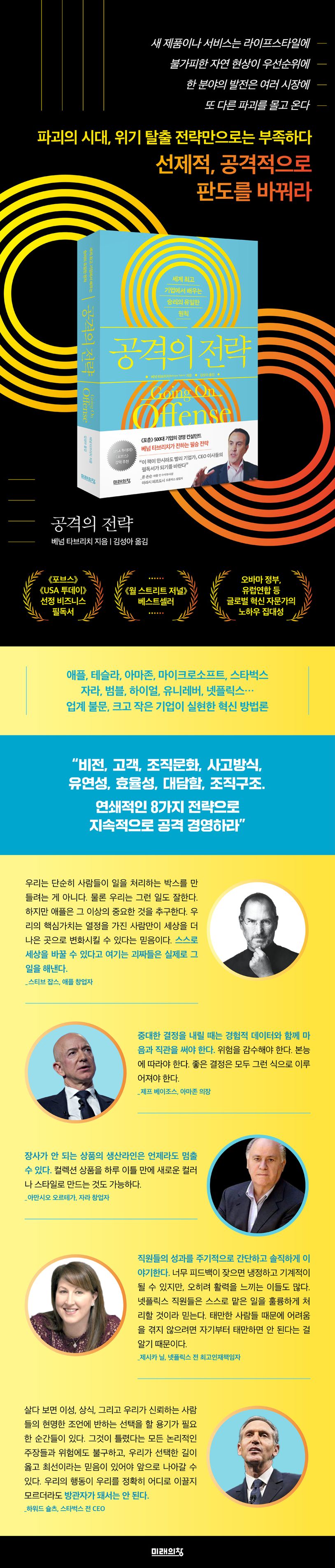 애플, 테슬라, 아마존, 마이크로소프트, 스타벅스. 처음부터 성공만 했을 것 같은 이 기업들도 알고 보면 크고 작은 실패를 거쳤다. 스티브 잡스는 자신이 뽑은 사람으로 인해 애플에서 쫓겨났고, 아마존의 제프 베이조스는 파이어폰이라는 웅장한 프로젝트를 시도했지만 처참하게 실패했다. 마이크로소프트의 사티아 나델라는 회사의 정체성이었던 윈도가 더 이상 사업성이 없다는 뼈아픈 현실을 받아들여야 했다. 기업 전체를 흔들만한 실패와 위기였지만 이들 기업은 혁신의 기회로 삼아 또 한 번의 성공을 이끌었다. 《공격의 전략》은 그러한 혁신 전략을 8가지로 정리하고 구체적인 가이드를 제공한다.