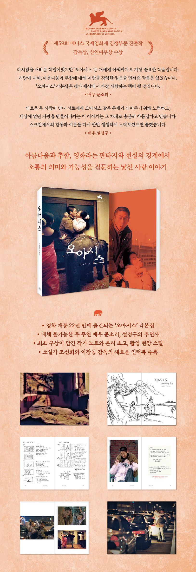 2002년 제59회 베니스 국제영화제에 초청되어 감독상과 신인여우상(문소리)을 수상한 이창동 감독의 세 번째 연출작 ‘오아시스’가 영화 개봉 22년 만에 각본집으로 출간됐다. 이 책에는 국내외 비평가들이 극찬한 두 주연 배우 문소리와 설경구의 추천사, ‘오아시스’의 최초 아이디어와 구상이 담긴 작가 노트, 이창동 감독이 직접 쓰고 그린 콘티 초고, 어렵고 난해하기로 유명했던 촬영 현장의 분위기를 느낄 수 있는 스틸 사진 등이 다수 수록되어 있다. 특히 이번 각본집에는 2002년 영화 개봉 당시 영화 주간지 《씨네21》의 편집장으로서 이창동 감독을 인터뷰했던 조선희 작가가 그로부터 22년이 지난 2024년에 이창동 감독을 다시 만나 진행한 특별 인터뷰가 수록되었다.