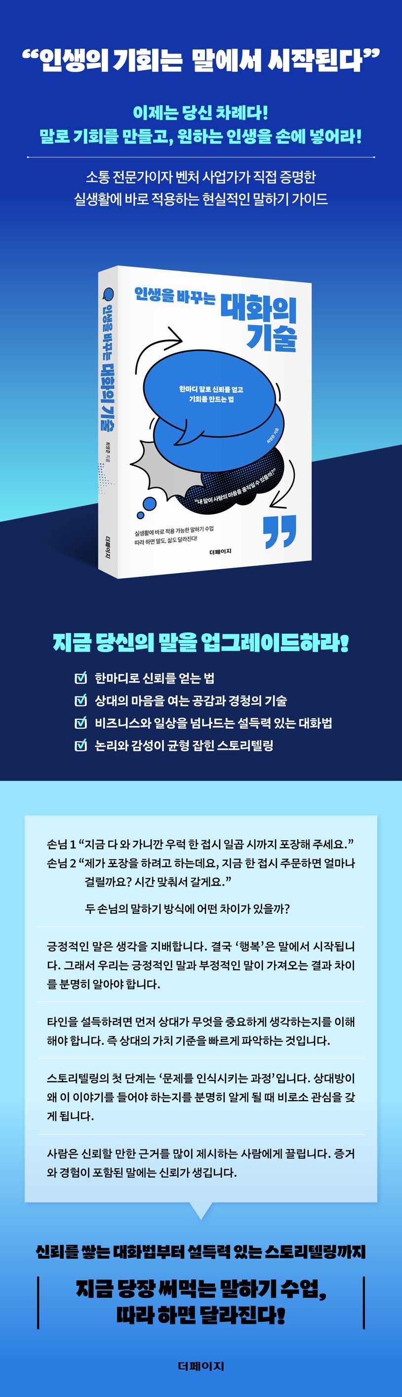 이 책은 ‘듣기, 사고하기, 말하기’라는 소통의 세 가지 핵심 요소를 기반으로 한다. 많은 말하기 책이 화려한 표현법이나 논리적 구성에 집중하는 반면, 이 책은 대화의 본질을 파고든다. 상대방의 마음을 여는 공감과 경청의 기술, 비즈니스와 일상에서 적용할 수 있는 신뢰를 쌓는 대화법, 그리고 논리와 감성을 균형 있게 활용하는 설득의 원리까지 말하기의 모든 핵심을 담고 있다. 저자가 직접 경험한 수많은 사례와 다양한 예시를 바탕으로 한 이 책은, 말하기를 통해 더 많은 기회를 만들고 마침내 인생을 바꾸고 싶은 사람들에게 최고의 실용서가 될 것이다.