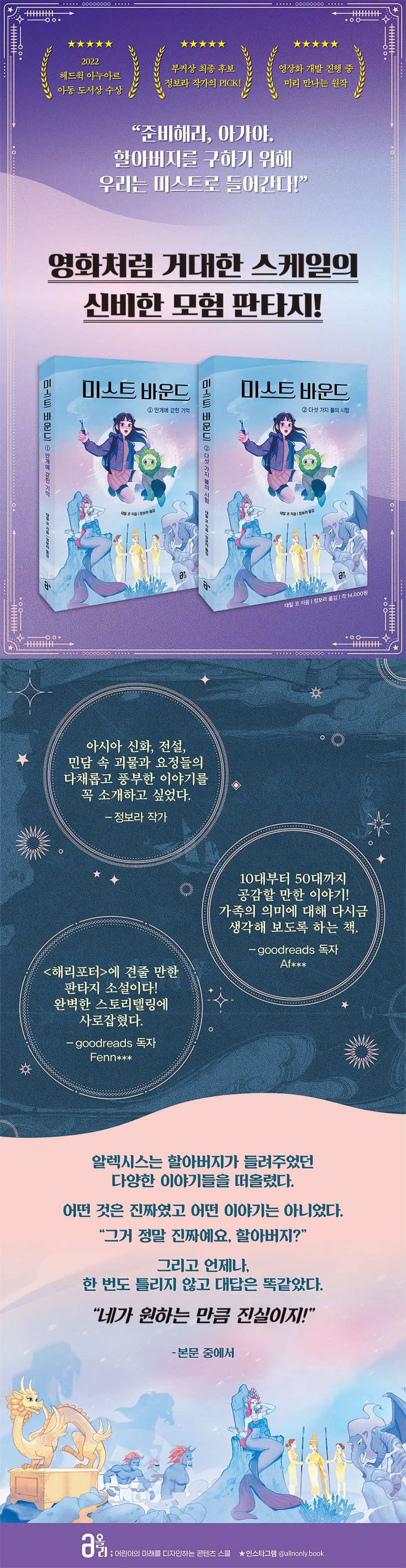헤드윅 아누아르 아동 도서상 수상, 싱가포르 도서상 “BEST YOUNG PERSONS TITLE”과 “올해의 책” 후보에 오르며 2022년 싱가포르에서 가장 뜨거운 데뷔작으로 주목받은 대릴 코의 〈미스트 바운드〉가 드디어 한국에 출간되었다. 민담에 등장하는 환상적 존재와 무시무시한 괴물들을 하나씩 상대하며 모험을 펼쳐 나가는 흥미진진한 판타지 소설 〈미스트 바운드〉는 퀘스트를 하나씩 깨 나가는 듯 속도감 있는 전개, 희망과 사랑이 무엇보다 중요하다는 깊은 주제가 특징이다. 현재 헐리우드와 한국을 잇는 글로벌 제작사 겸 매니지먼트 B&C 콘텐츠에서 영상화를 염두하고 애니메이션을 개발 중이며, 〈어벤져스 어셈블〉 〈스타워즈: 레지스탕스〉 〈복스 마키나의 전설〉 〈블레이드 러너: 블랙 로터스〉 〈벤 10〉 등의 주요 애니메이션 시리즈를 집필한 유진 손이 시나리오를 작업 중이다.