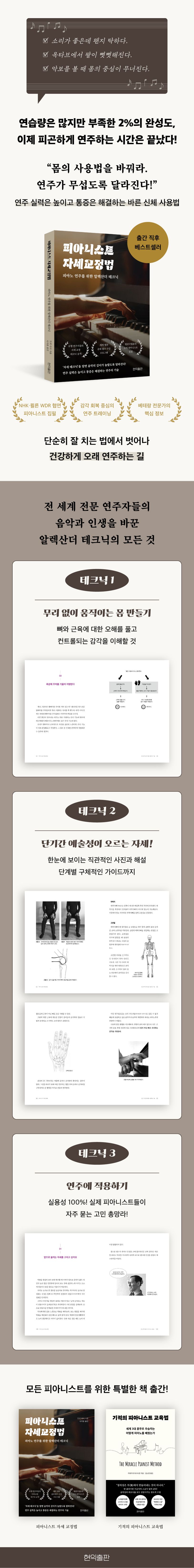 피아니스트들이 이 책을 통해 얻게 될 가장 큰 변화는 내면의 이미지와 감정을 그대로 음악으로 표현할 수 있게 된다는 점이다. 연주를 ‘자세’와 ‘사용 습관’이라는 관점에서 바라보게 해주며, 그 연습법을 실제 레슨 사례와 함께 명확히 제시한다. 그 연습법이 바로 알렉산더 테크닉이다. 알렉산더 테크닉은 목과 허리 통증을 비롯한 각종 만성 질환의 완화, 감각과 인지 기능 향상에 탁월한 효과를 보인다. 이 책은 이러한 접근을 통해 피아니스트의 불필요한 긴장을 줄이고, 피아노의 음색을 더욱 맑고 깊게 만들며, 악보 속 화성과 음정이 가진 이미지를 더욱 정밀하게 표현할 수 있게 돕는다.