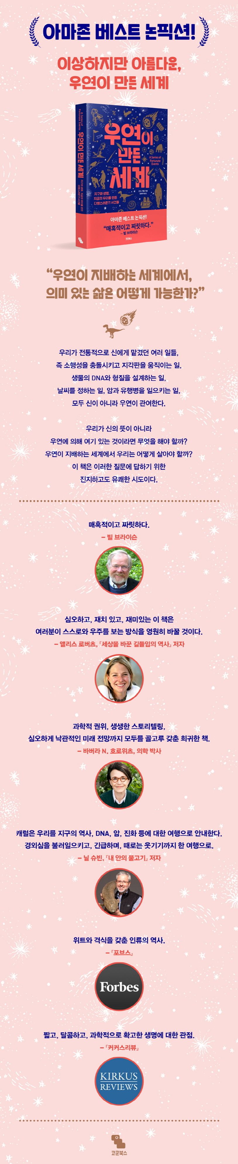 캐럴은 최신의 과학이 밝혀낸 흥미로운 이야기들을 들려준다. 행성 수준에서 분자 수준에 이르는 놀라운 발견들을 소개하고, 전 지구적 대격변의 이야기, 인간을 포함하여 모든 생명체의 모든 세포 내에서 작동하는 우연의 기제에 대해서도 이야기한다. 우연에서 비롯한 ‘실수’들이 어떻게 전염병과 가뭄, 기타 문명을 뒤바꾼 격변들을 초래하고, 우리가 지구에서 함께 살아가는 경이롭고 아름다운 모든 생명체들의 바탕이 되는지에 대해서도 가르쳐준다.