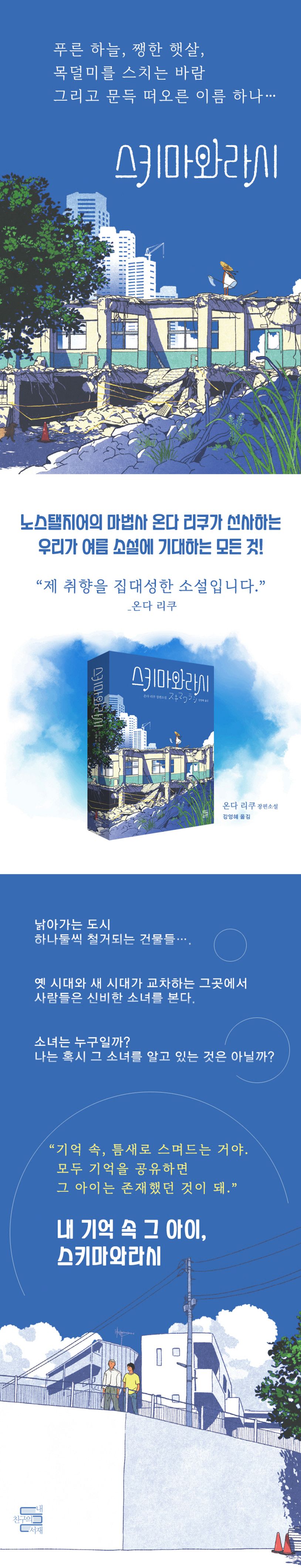 일본 최고의 권위를 자랑하는 양대 문학상 ‘나오키상’과 ‘서점대상’을 동시에 수상한 유일한 작가 온다 리쿠의 신작 장편소설이 출간되었다. 《스키마와라시》는 낡아가는 도시 속 철거되는 건물들, 그곳에 나타나는 신비한 소녀의 이야기를 온다 리쿠 특유의 향수 어린 시선으로 담아내었다.