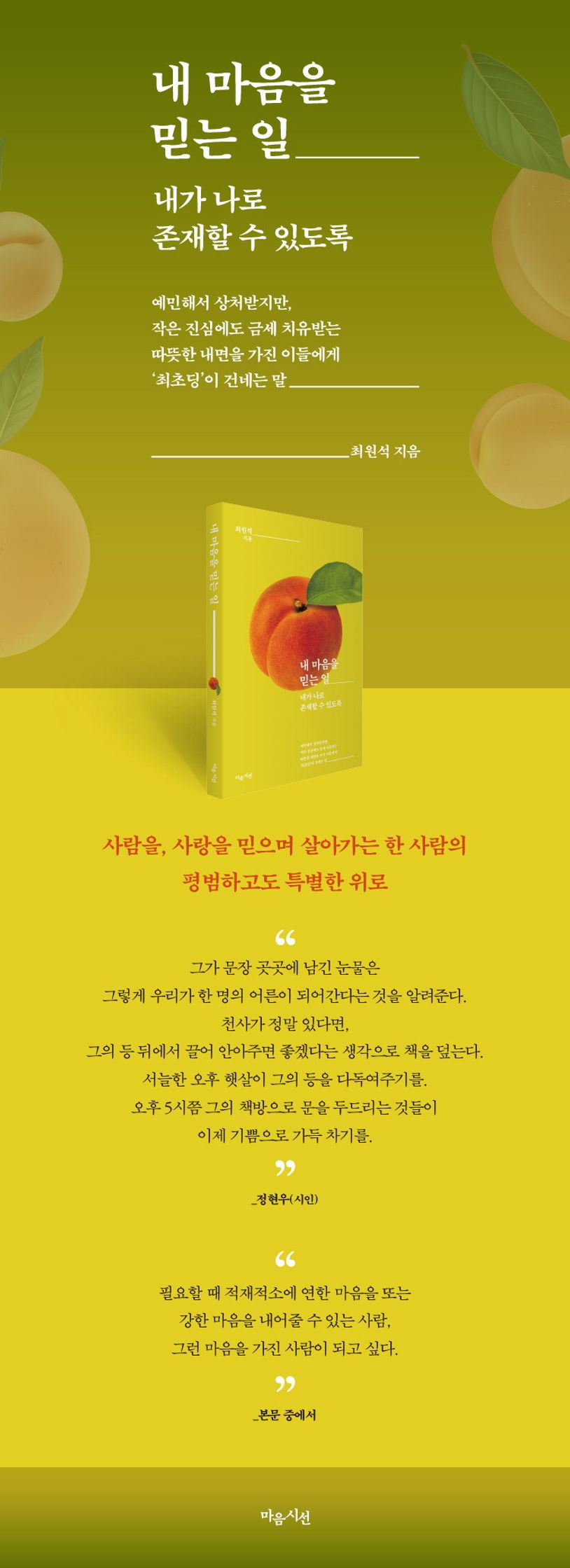 《내 마음을 믿는 일》은 유명 북스타그래머 ‘최초딩’이 서른넷에서 서른여섯의 나이를 거치며 겪은 일과 그 경험을 통한 성장을 담은 책이다. 그는 이 시간 동안, 국내 대형출판사에서 출판마케터로 치열하게 일하며 좋아하는 책을 알렸고, 한편으로는 사랑하는 부모님의 건강 악화를 옆에서 지켜보며 보살펴야 했다. 고령의 아버지가 쓰러지면서 집, 회사, 병원을 오가는 생활이 이어질 때에도, 사랑하는 사람이 영원히 떠나갔을 때에도 저자는 꾸준히 글을 썼다. 슬프고 힘들었지만, 오히려 “감정의 소용돌이 속에서 자신을 잃지 않았던 것은 자신의 마음을 글로 써서 스스로를 돌아봤기 때문”이었다. 어른이 되고 싶지 않았기에 ‘초딩’이라는 닉네임을 지었던 저자는 부모님을 책임지는 보호자의 시간을 거쳐, 가장 가까운 가족을 떠나보내며 ‘어른’이라는 말에 가까워졌고, 이전보다 성장했다. 몸과 마음이 무너지는 듯한 날들이었지만, 자신을 지탱해주는 많은 것들을 깨닫는 날들이기도 했다. 이 책은 그 소중한 시간을 써내려간 솔직하고 따뜻한 기록이다.
