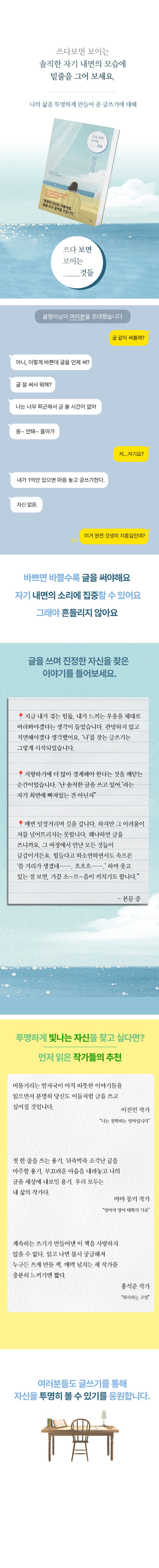 빠르게 변하는 세상에 휩쓸려 나답게 살기 어려워졌다. 누구나 한번은 ‘나다운 삶을 살아가고 있나’라고 고민한다. ⟪쓰다 보면 보이는 것들⟫은 진정한 자신을 찾고 싶어 하는 사람들을 위한 위로와 격려의 메시지다. 세 작가는 글쓰기를 통해 자기 삶을 투명하게 볼 수 있다고 한다. 글쓰기 덕분에 진정한 자신을 발견하고, 삶이 어떻게 확장되는지 보여준다.