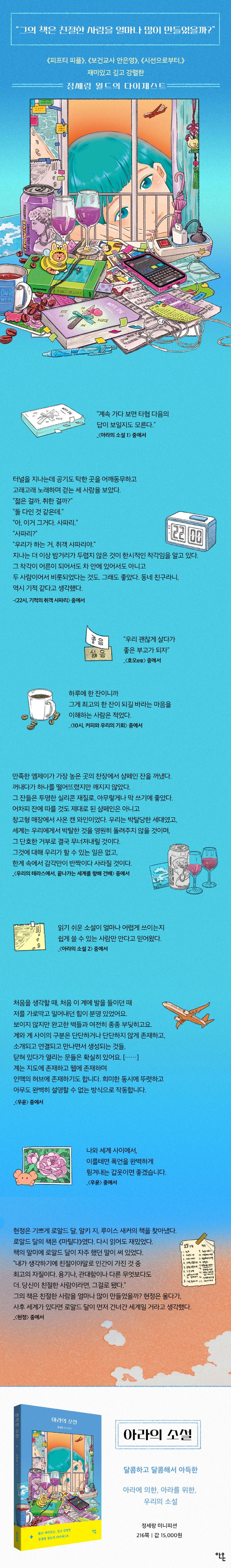 작가가 “가장 과감한 주인공에게 자주 붙이는” 이름이라는 ‘아라’는 책 속 여러 작품에서 반복해 등장한다. 소설가의 정체성을 지닌 아라는 짐짓 작가의 분신처럼 보이지만, 작품 전반의 세계관을 지탱하는 친절하고도 신랄한 캐릭터다. 아라의 고향, 아라의 경험, 아라의 친구, 아라의 세대 등으로 드러나는 정세랑 월드의 단면은, 그 뒤의 존재할 거대한 무언가를 상상하게 한다. 그 상상이 무엇이든 그것은 바로 당신의 이야기일 것이다. 아라를 통해 우리의 이야기를 쓰는 것, 그것의 정세랑의 글쓰기이고 ‘아라의 소설’이다.