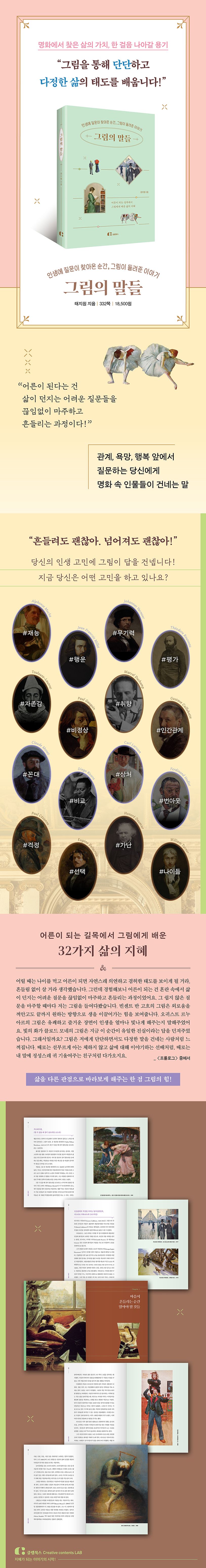 작가는 이 책을 “어른이 되는 길목에서 그림에게 배운 삶의 지혜를 담은 책”이라고 소개한다. 어른이 된다는 건 삶이 던지는 어려운 질문들을 끊임없이 마주하고 흔들리는 과정인데, 작가는 그런 순간마다 그림 속에서 답을 찾을 수 있었다고 한다. 매사에 의연하거나 초연할 수는 없지만, 흔들림 속에서도 중심을 잡으며 한 발짝씩 나아가는 것이 어른이 되어가는 과정임을 깨달았다고 말하는 그는 자신처럼 삶이 던진 질문 앞에서 흔들리고 있는 누군가에게 도움이 되길 바라는 마음으로 그가 그림을 통해 얻은 32가지 통찰과 지혜를 전한다.