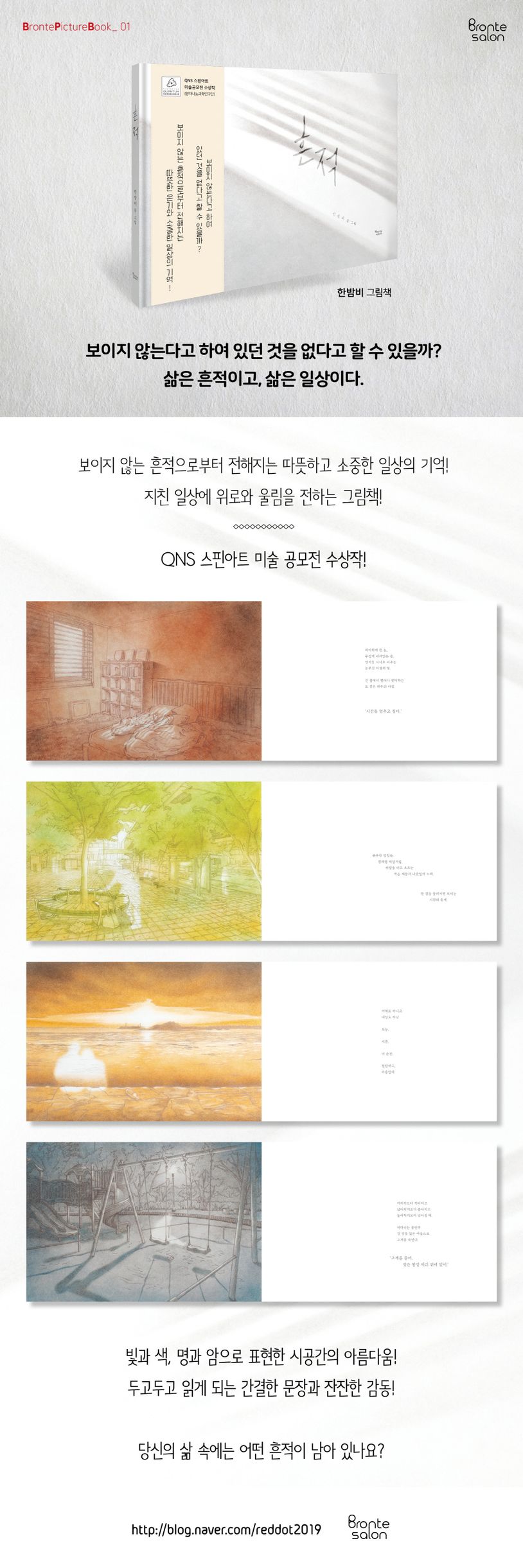 작가는 일상 속의 흔적을 통해 우리를 또 다른 차원의 세계로 안내합니다. 보이지 않지만 우리 안에 남아 있는 그리운 기억들을 소환합니다. 스쳐 가며 놓쳤던 것들, 익숙해져 잊었던 것들, 바쁜 일상에 치어 미루어두었던 것들을 이 책을 통해 다시 떠올려 보세요. 섬세한 그림과 정제된 글은 우리 모두에게 각각 다른 이야기를 전합니다. 따뜻한 그림과 다정한 말들로 위로받을 수 있는 건 아이들만이 아니지요. 어른들에게도 일상의 위로는 무한한 힘을 실어줍니다. 어쩌면 삶을 살아가며 고통의 경험과 흔적이 깊게 자리한 어른들에게 더 필요한 것일지도 모릅니다. 그때의 시간, 그곳에 있던 사람들, 그런 모습을 묵묵히 지켜봐 주던 다정한 마음들. 이 그림책은 우리의 삶은 그다지 대단하지 않은 것들로 이루어지고, 그렇기에 누구나 삶의 아름다움을 발견하며 살 수 있다고 말합니다. 삶이 곧 흔적이고, 흔적이 모여 만들어 낸 일상이 곧 삶이라고 말합니다. 이 책을 통해 반짝이는 일상의 소중함과 잔잔한 감동을 느낄 수 있을 것입니다. 그리고 오늘, 지금, 이 순간이 찬란하고 아름답다는 사실을 다시 깨달을 수 있을 것입니다.