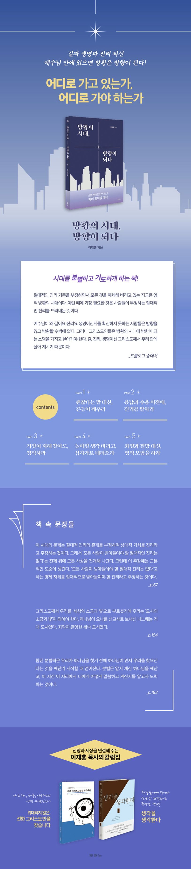 이 세상의 진리의 기준은 예수 밖에 없다. 그 분만이 길이요 진리요 생명이시다. 이를 확신하지 못하는 사람들은 방향을 잃고 방황할 수밖에 없다. 그러므로 그리스도인들은 방황의 시대에 방향이 되시는 예수 그리스도를 세상에 전파함으로 사람들을 바른 방향으로 인도하는 소명으로 살아야 한다. 이 책은 예수가 어떻게 방황하는 시대에 길과 진리와 생명과 방향이 되는지, 코로나, 낙태, 포스트모더니즘, 사회적 성 등을 키워드로 설명하고 있는 칼럼집이다. 책이 길을 잃고 방황하는 이들에게 뚜렷하고 정확한 방향 감각을 되찾는 데 조금이나마 기여하기를 소망한다.