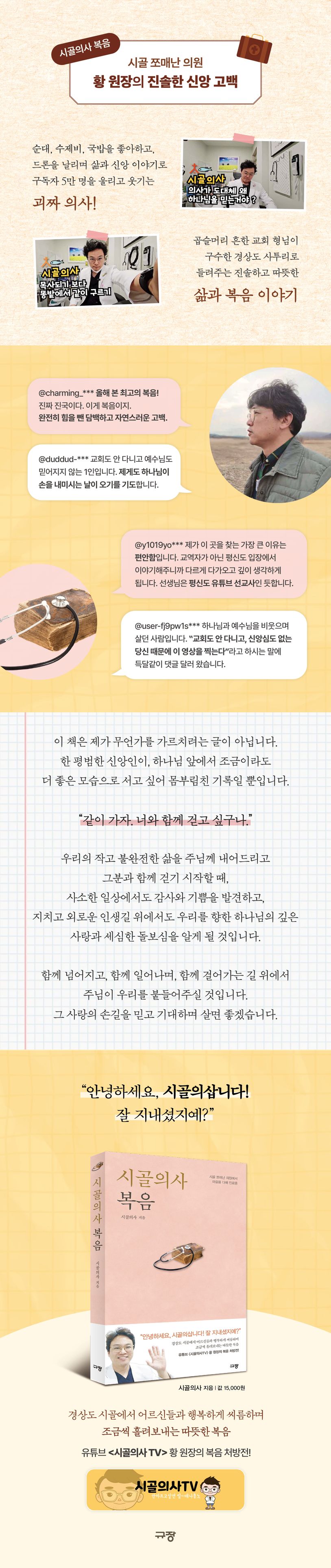 저자는 시골에서 환자를 돌보며 두 딸을 키우고, 매주 교회에서 찬양대를 지휘하며 섬기고 있다. 그는 죽음과 삶의 경계, 용서와 기도의 어려움, 공동체와 신앙의 본질에 대한 깊은 사유를 진솔하면서도 유머러스하게 이 책에 담아냈다. 일상의 소소한 순간 속에서도 신앙의 본질을 포착해내는 그의 시선은 때로는 깊고, 때로는 따뜻하다. 특히 유튜브 채널 〈시골의사TV〉에서 전해온 꾸밈없는 위로와 격려가 이 책 곳곳에도 고스란히 배어 있다.
