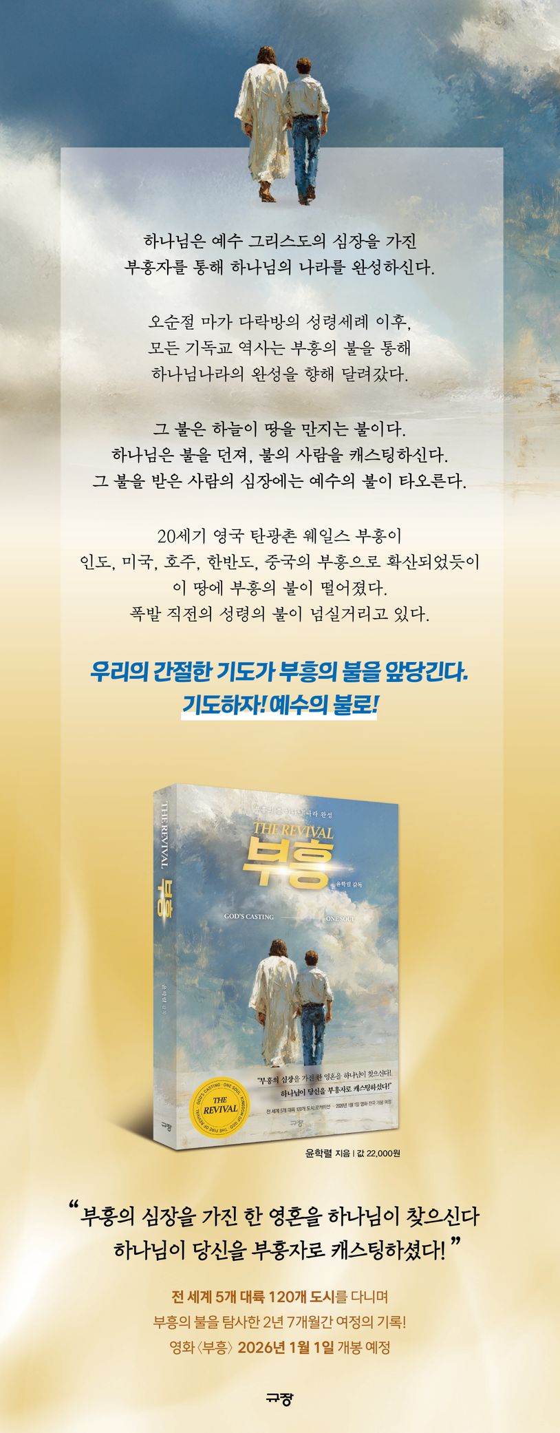 드라마나 영화에서 캐스팅과 로케이션이 중요하듯, 하나님의 역사에서도 사람과 장소가 중요하다. 하나님은 땅을 선택하시고 사람을 캐스팅하셔서 부흥의 불을 던져주신다. 하나님은 방송작가 출신의 영화감독인 저자를 부흥자이자 부흥의 기록자로 캐스팅하셔서 영화〈부흥〉을 찍게 하셨다. 이 책은 5개 대륙 120개 도시를 다니며 130여 명의 부흥 증거자를 만난 2년 7개월간 여정의 기록이다. 부흥은 성령 하나님이 택하신 ‘한 영혼’으로부터 시작된다. 저자는 부흥을 준비하고 기도하는 부흥자로 이 책의 독자 한 명 한 명을 부르셨음을 확신으로 전하고 있다. 영화 〈부흥〉은 2026년 1월 1일 전국