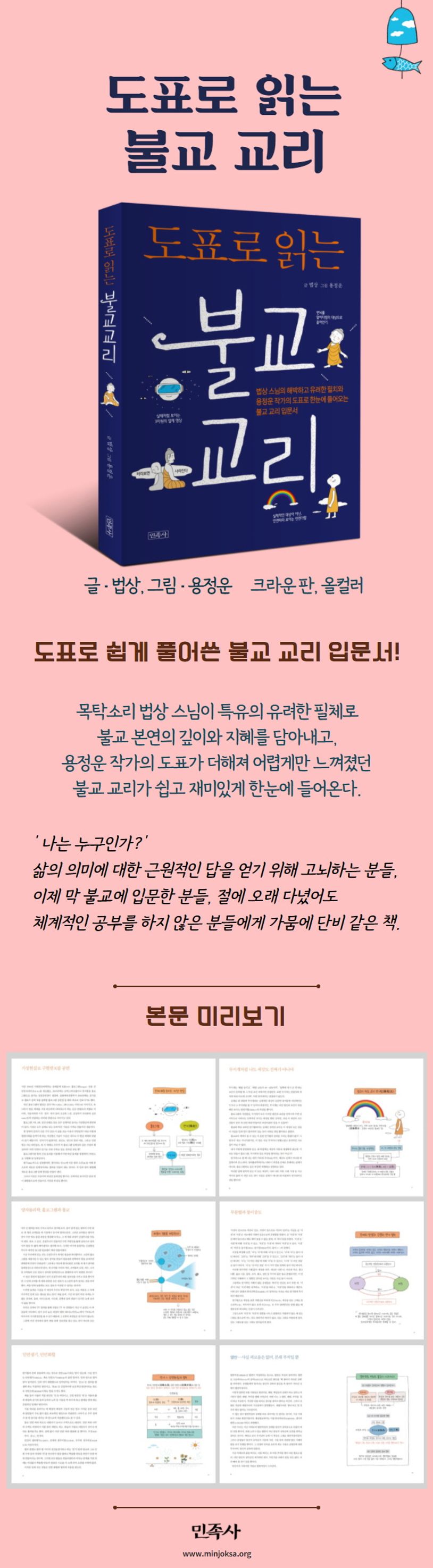 ‘도표로 읽는’ 시리즈 세 번째 책, 『도표로 읽는 불교 교리』는 유튜브채널 ‘법상스님의 목탁소리’를 통해 종교를 초월해 7만여 구독자와 소통하고 있는 법상 스님이 글을 쓰고, 명상카툰과 그림으로 불교를 전해 온 용정운 작가가 도표를 그렸다. 법상 스님 특유의 유려한 필치로 막연하고 어렵게만 느껴지는 불교 교리를 알기 쉽게 체계적으로 서술하고 있다. 섬세하고 아기자기한 용정운 작가의 카툰과 도표는 불교를 처음 접한 독자들도 불교 교리에 쉽게 다가갈 수 있도록 한다.