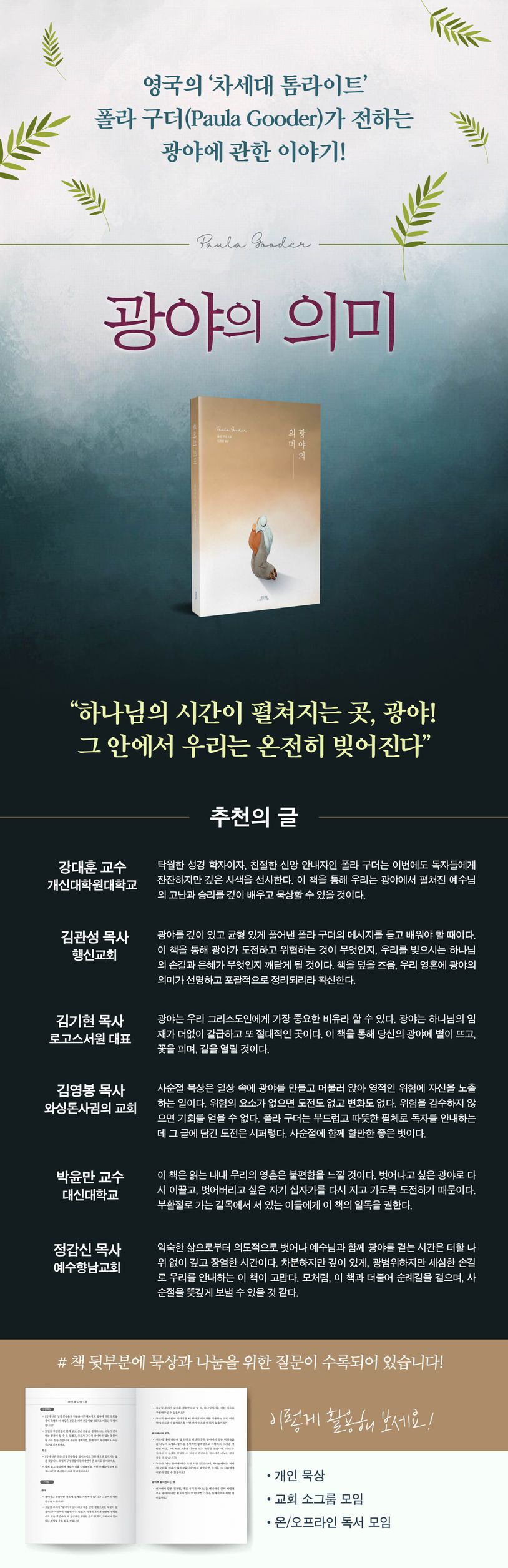 - 신구약성경이 말하는 광야의 의미를 깊이 헤아리고, 그것이 우리 삶에 어떻게 적용될 수 있는지를 보여준다.
