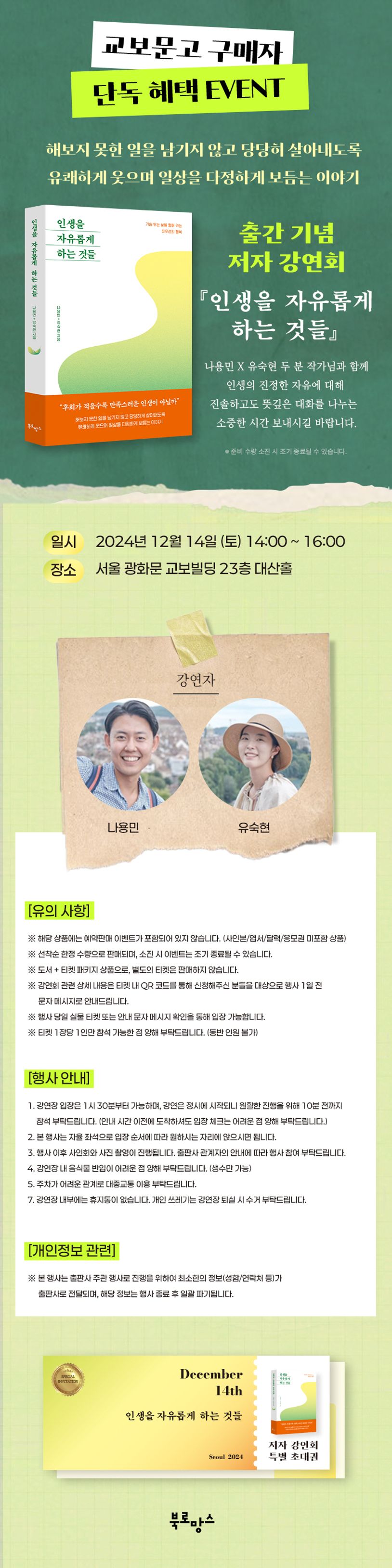 ※ 본 행사는 출판사 주관 행사로 진행을 위하여 최소한의 정보(성함/연락처 등)가 출판사로 전달되며, 해당 정보는 행사 종료 후 일괄 파기됩니다.